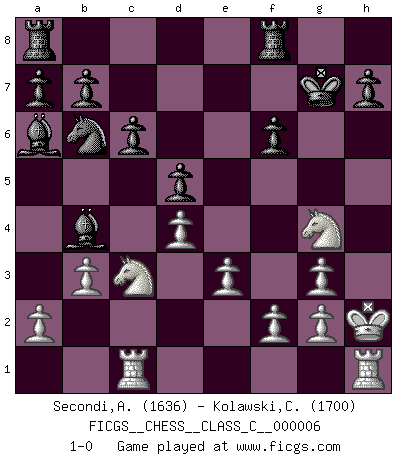 Last move : 1-0 2006 October 27 14:14:13 [Event "FICGS__CHESS__CLASS_C__000006"] [Site "FICGS"] [Date "2006.05.31"] [Round "1"] [White "Secondi,Alberto"] [Black "Kolawski,Christof"] [Result "1-0"] [WhiteElo "1636"] [BlackElo "1700"] 1.d4 d5 2.c4 e6 3.cxd5 exd5 4.Nc3 Nf6 5.Bf4 Be7 6.e3 Bf5 7.Nf3 c6 8.Be2 Nbd7 9.O-O Ne4 10.Bd3 g5 11.Bg3 O-O 12.Qb3 Nxg3 13.hxg3 Bxd3 14.Rfd1 Ba6 15.Kh2 Qb6 16.Qxb6 Nxb6 17.b3 Kg7 18.Rh1 Bb4 19.Rac1 g4 20.Ne5 f6 21.Nxg4 1-0 This chess game has been lost on time (started : 2006.05.31 8:2:36) Queen's gambit declined Kingside Castling by player White (move 9) Kingside Castling by player Black (move 11) Player White won this chess game. Follow this game move after move (download)Chess is really ninety nine percent calculation. (Soltis) Habe Mut, dich deines eigenen Verstandes zu bedienen. (Immanuel Kant) Un buen sacrificio es aquel que aunque no sea necesariamente sólido, deja a tu oponente aturdido y confuso. (Rudolph Spielmann) Echiquier : carré parfait, comme la Jérusalem nouvelle décrite par l'auteur de l'Apocalypse, huit cases sur huit, exaltation du chiffre 4, symbole du cosmos aux quatre horizons... où le noir et le blanc, l'ombre et la lumière, le mal et le bien s'entremêlent et se conjuguent. (Robert Couffignal, Le Gambit du poète) Somehow our devils are never quite what we expect when we meet them face to face. (Nelson DeMille)