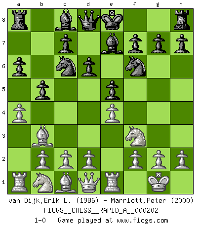 Last move : 1-0 2017 September 10 19:30:4 [Event "FICGS__CHESS__RAPID_A__000202"] [Site "FICGS"] [Date "2017.06.16"] [Round "1"] [White "van Dijk,Erik L."] [Black "Marriott,Peter"] [Result "1-0"] [WhiteElo "1986"] [BlackElo "2000"] 1.e4 e5 2.Nf3 Nc6 3.Bb5 a6 4.Ba4 Nf6 5.O-O Be7 6.Re1 b5 7.Bb3 d6 8.a4 1-0 This chess game has been lost on time (started : 2017.06.16 15:34:42) Ruy Lopez : Closed Kingside Castling by player White (move 5) Player White won this chess game. Follow this game move after move (download)Best by test: 1. e4 (Bobby Fischer) Alles was am Schachbrett zählt sind gute Züge. (Robert James Fischer) El arma más poderosa en el Ajedrez, es tener la próxima movida. (David Bronstein) C'est la seule position que je connaisse où les deux camps sont mals. Propos prêtés à V. Anand. The obstacle is the path. (Zen proverb)