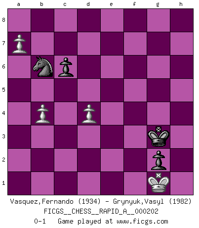 Last move : 0-1 2017 October 1 9:49:24 [Event "FICGS__CHESS__RAPID_A__000202"] [Site "FICGS"] [Date "2017.06.16"] [Round "1"] [White "Vasquez,Fernando"] [Black "Grynyuk,Vasyl"] [Result "0-1"] [WhiteElo "1934"] [BlackElo "1982"] 1.e4 e5 2.Nf3 Nc6 3.d4 exd4 4.Nxd4 Bc5 5.Be3 Qf6 6.c3 Nge7 7.Bc4 Ne5 8.Be2 Qg6 9.O-O d6 10.f3 O-O 11.Nd2 d5 12.Kh1 dxe4 13.fxe4 Bg4 14.Bf4 Bxe2 15.Qxe2 Bd6 16.Rad1 a6 17.Bxe5 Bxe5 18.N2f3 Qf6 19.a4 Ng6 20.a5 Rad8 21.g3 Bxd4 22.cxd4 Qe7 23.Qc2 Rfe8 24.Rde1 h6 25.Kg2 c6 26.Rf2 Nf8 27.Qb3 Rd7 28.h4 Rd6 29.Rd2 Qd7 30.Rd3 Re7 31.Qb4 Qd8 32.Rd2 R6d7 33.Qa3 Qe8 34.Qd3 Rd6 35.Rde2 Ne6 36.Qc3 Qd7 37.Rd2 Nc7 38.Qc5 Rde6 39.Qc2 Qe8 40.Qb3 Rxe4 41.Rxe4 Rxe4 42.Qxb7 Nd5 43.Qxa6 Re3 44.Qf1 Qe4 45.a6 g5 46.hxg5 hxg5 47.a7 Nb6 48.Kh2 Rxf3 49.Re2 Qf5 50.Re8+ Kg7 51.Qe1 Qc2+ 52.Kg1 Rf5 53.Re5 Kg6 54.Rxf5 Kxf5 55.Qf1+ Kg4 56.Qf2 Qxf2+ 57.Kxf2 f5 58.Kg2 f4 59.gxf4 Kxf4 60.Kf2 g4 61.Kg2 g3 62.b3 Na8 63.b4 Nb6 64.Kg1 Kf3 65.Kf1 g2+ 66.Kg1 Kg3 0-1 Scotch game Kingside Castling by player White (move 9) Kingside Castling by player Black (move 10) 10 pieces endgame at move 57 : White KPPPP , Black KNPPP WHITE : King + 4 Pawns BLACK : King + 1 Knight 3 Pawns 9 pieces endgame at move 59 : White KPPPP , Black KNPP WHITE : King + 4 Pawns BLACK : King + 1 Knight 2 Pawns 8 pieces endgame at move 59 : White KPPP , Black KNPP WHITE : King + 3 Pawns BLACK : King + 1 Knight 2 Pawns Player Black won this chess game. Follow this game move after move (download)Without error there can be no brilliancy. (Emanuel Lasker) Ohne Fehler kann es keine Brillanz geben. (Emanuel Lasker) El Ajedrez es despiadado: debes de estar preparado para matar gente. (Nigel Short) Il n'y a plus de joueurs du niveau de Jacob Murray dont la seule quête est le beau jeu, le plaisir de voir les pièces construire quelque chose. Sur 10 idées à la minute, 9 seront sans intérêt, la dernière s'avèrera géniale. (Christian Bauer) There are more things in heaven and earth than practically anywhere else. (Unknown)