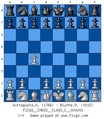 Last move : 1-0 2017 July 29 0:47:50 [Event "FICGS__CHESS__CLASS_C__000243"] [Site "FICGS"] [Date "2017.06.17"] [Round "1"] [White "Duttagupta,Aniruddha"] [Black "Blythe,Doug"] [Result "1-0"] [WhiteElo "1786"] [BlackElo "1615"] 1.c4 1-0 This chess game has been lost on time (started : 2017.06.17 22:6:58) English Opening Player White won this chess game. Follow this game move after move (download)Chess, like any creative activity, can exist only through the combined efforts of those who have creative talent, and those who have the ability to organize their creative work. (Mikhail Botvinnik) Frage des Reporters: -Worin besteht das Ziel von Gambiteröffnungen? Antwort: -Auf Kosten der Partie einen Ruf als Angriffspieler zu erwerben.- (Siegbert Tarrasch) Un Peón pasado aumenta su poder a medida de que el número de piezas en el tablero disminuye. (Capablanca) Pour se monter efficace, un Cavalier a besoin d'avant-postes ! Les Cavaliers font les meilleurs bloqueurs de pions passés. A good player is always lucky. (Capablanca)