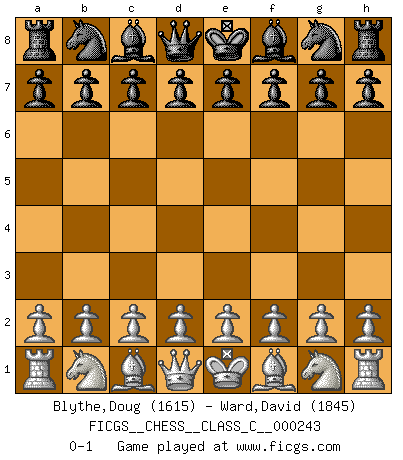Last move : 0-1 2017 July 28 0:46:33 [Event "FICGS__CHESS__CLASS_C__000243"] [Site "FICGS"] [Date "2017.06.17"] [Round "1"] [White "Blythe,Doug"] [Black "Ward,David"] [Result "0-1"] [WhiteElo "1615"] [BlackElo "1845"] 0-1 This chess game has been lost on time (started : 2017.06.17 22:6:58) Player Black won this chess game. Follow this game move after move (download)Chess is above all, a fight ! (Emanuel Lasker) Es war undenkbar für die Behörden, dass ein sowjetischer Großmeister auf diese Art und Weise [Fischer-Taimanov 6:0] verliert, ohne dass es eine politischer Erklärung dafür gäbe. (Mark Taimanov) A la fecha, Fischer esta simplemente un nivel arriba de todos los mejores jugadores de Ajedrez del mundo. (John Jacobs) Les Echecs ont trois composantes : le temps, l'espace et le matériel en dernier. (Mikhail Tal) Is not life a hundred times too short to bore ourselves ? (Friedrich Nietzsche)