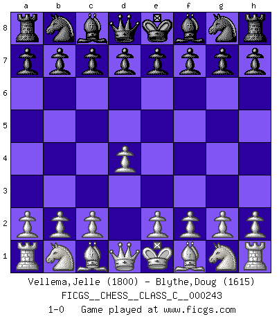 Last move : 1-0 2017 July 28 12:46:2 [Event "FICGS__CHESS__CLASS_C__000243"] [Site "FICGS"] [Date "2017.06.17"] [Round "1"] [White "Vellema,Jelle"] [Black "Blythe,Doug"] [Result "1-0"] [WhiteElo "1800"] [BlackElo "1615"] 1.d4 1-0 This chess game has been lost on time (started : 2017.06.17 22:6:58) Queen's pawn Player White won this chess game. Follow this game move after move (download)The Pawns are the soul of the game. (Francois Andre Danican Philidor) Ich rechne überhaupt nicht voraus. Ich gewinne auch so. (Robert James Fischer) De todos mis libros Rusos, la defensa contiene y difunde el 'calor' mas grande que pudiese verse extraño al observar lo supremamente abstracto que el Ajedrez supuestamente es. (Vladimir Nabokov) Un footballeur joue avec ses pieds, parfois avec sa tête. Un joueur d'échecs ne joue qu'avec sa tête. Et quand il ne joue plus, il meurt. (Jacob Murray) Excelling at chess has long been considered a symbol of more general intelligence. That is an incorrect assumption in my view, as pleasant as it might be. But for the purposes of argument and investigation, chess is, in Russkin-Gutman's words, 'an unparalleled laboratory, since both the learning process and the degree of ability obtained can be objectified and quantified, providing an excellent comparative framework on which to use rigorous analytical techniques.' (The Chess Master and the Computer, by Garry Kasparov - 2010)