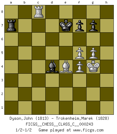Last move : 1/2-1/2 2017 December 9 19:0:29 [Event "FICGS__CHESS__CLASS_C__000243"] [Site "FICGS"] [Date "2017.06.17"] [Round "1"] [White "Dyson,John"] [Black "Trokenheim,Marek"] [Result "1/2-1/2"] [WhiteElo "1813"] [BlackElo "1828"] 1.Nf3 d5 2.g3 Bg4 3.Bg2 c6 4.b3 Nd7 5.Bb2 Ngf6 6.O-O e6 7.d3 Bd6 8.Nbd2 O-O 9.h3 Bh5 10.e4 e5 11.c4 dxe4 12.dxe4 Qe7 13.Qc2 Ba3 14.Bc3 Rfd8 15.Nh4 Ne8 16.Nf5 Qc5 17.g4 Bg6 18.Nb1 Bb4 19.Bb2 Qf8 20.a3 Be7 21.b4 h5 22.Rd1 a5 23.c5 hxg4 24.hxg4 Nef6 25.Qe2 b6 26.cxb6 Nxb6 27.Bxe5 Bxf5 28.exf5 axb4 29.axb4 Rxd1+ 30.Qxd1 Rd8 31.Qf3 Nfd5 32.Nd2 Bxb4 33.Ne4 Nc4 34.Bg3 Nd2 35.Nxd2 Bxd2 36.Qe4 Qc5 37.Bf3 Nc3 38.Qxc6 Ne2+ 39.Kg2 Qxc6 40.Bxc6 Nxg3 41.Kxg3 Kf8 42.Ra4 Bc3 43.f4 Rd4 44.Ra8+ Ke7 45.Kf3 Kd6 46.Be4 Ke7 47.g5 Rd7 48.Rc8 Bd4 49.Kg4 Ra7 1/2-1/2 Reti : King's Indian attack (Barcza system) Kingside Castling by player White (move 6) Kingside Castling by player Black (move 8) This chess game ended in a draw. Follow this game move after move (download)I have never in my life played the French Defence, which is the dullest of all openings. (Wilhelm Steinitz) Jeder leidlich begabte Spieler, er braucht keineswegs hervorragend veranlagt zu sein, kann es zum Meister bringen. Aber das ist ja auch gar nicht nötig! Der richtige Standpunkt ist es, zu seinem Vergnügen zu spielen, und man glaube ja nicht, dass der Genuss proportional dem Können sei. (Siegbert Tarrasch) Los Peones son nacidos libres, y aún así, se encuentran encadenados por todos lados. (Rick Kennedy) Les échecs, c'est l'imagination. (David Bronstein) Computer Science is no more about computers than astronomy is about telescopes. (Edsger W. Dijkstra)