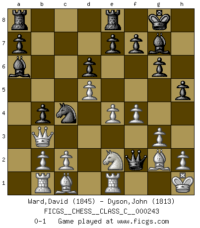 Last move : 0-1 2017 October 16 7:7:1 [Event "FICGS__CHESS__CLASS_C__000243"] [Site "FICGS"] [Date "2017.06.17"] [Round "1"] [White "Ward,David"] [Black "Dyson,John"] [Result "0-1"] [WhiteElo "1845"] [BlackElo "1813"] 1.d4 Nf6 2.g3 c5 3.d5 b5 4.Bg2 d6 5.e4 g6 6.Ne2 Bg7 7.O-O Nbd7 8.Re1 O-O 9.Nd2 Re8 10.Nf1 h5 11.f4 Nb6 12.Ne3 Ng4 13.Rb1 Nxe3 14.Bxe3 Nc4 15.Bc1 Qa5 16.a3 b4 17.axb4 cxb4 18.Qd3 Ba6 19.Qb3 Qb6+ 20.Kh1 Qf2 0-1 Queen's pawn game Kingside Castling by player White (move 7) Kingside Castling by player Black (move 8) Player Black won this chess game. Follow this game move after move (download)All I want to do, ever, is just play Chess. (Bobby Fischer) Fischer ist das größte Genie, das je vom Schachhimmel heruntergestiegen ist. (Mikhail Nekhemyevich Tal) Alguna parte de un error es siempre correcto. (Savielly Tartakover) En blitz, le Cavalier l'emporte sur le Fou. (Vlastimil Hort) My poor ole parrot... Is not in the circulation of displays ....poo hoo hoo :) (Wayne Lowrance's enigma)