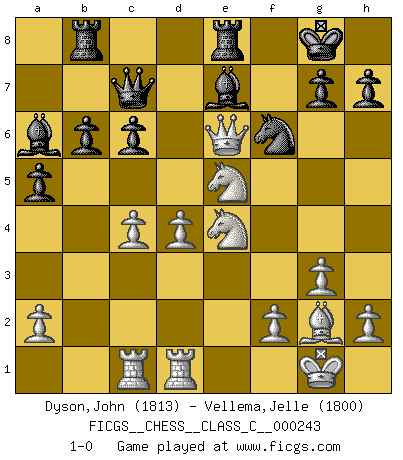 Last move : 1-0 2017 August 27 20:16:18 [Event "FICGS__CHESS__CLASS_C__000243"] [Site "FICGS"] [Date "2017.06.17"] [Round "1"] [White "Dyson,John"] [Black "Vellema,Jelle"] [Result "1-0"] [WhiteElo "1813"] [BlackElo "1800"] 1.Nf3 Nf6 2.c4 e6 3.Nc3 d5 4.d4 c6 5.g3 Be7 6.Bg2 O-O 7.O-O Nbd7 8.Qd3 b6 9.e4 a5 10.e5 Ne8 11.Rd1 Ba6 12.b3 f6 13.exf6 Bxf6 14.Qe2 Nc7 15.Bf4 Re8 16.Rac1 dxc4 17.bxc4 Nd5 18.Bd6 Nb8 19.Ne4 Be7 20.Bxb8 Rxb8 21.Ne5 Qc7 22.Qg4 Nf6 23.Qxe6+ 1-0 Reti Opening Kingside Castling by player Black (move 6) Kingside Castling by player White (move 7) Player White won this chess game. Follow this game move after move (download)Daring ideas are like Chess men moved forward. They may be beaten, but they may start a winning game. (Johann Wolfgang von Goethe) Schach ist ein schwarz-weisser Dschungel. (Garry Kasparov) Peones: ellos son el alma de esta partida, solos forman el ataque y la defensa. (Philidor) Ce n'est pas pour s'amuser qu'il joue aux échecs : il célèbre un culte. (Vladimir Nabokov) Shallow men believe in luck. Strong men belive in cause and effect. (Ralph Waldo Emerson)