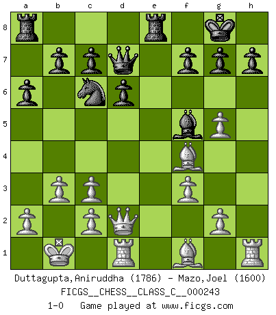 Last move : 1-0 2017 November 21 17:19:57 [Event "FICGS__CHESS__CLASS_C__000243"] [Site "FICGS"] [Date "2017.06.17"] [Round "1"] [White "Duttagupta,Aniruddha"] [Black "Mazo,Joel"] [Result "1-0"] [WhiteElo "1786"] [BlackElo "1600"] 1.e4 e5 2.Nf3 Nf6 3.Nxe5 d6 4.Nf3 Nxe4 5.Nc3 Nxc3 6.dxc3 Be7 7.Bf4 O-O 8.Qd2 Nc6 9.O-O-O Be6 10.Kb1 a6 11.h4 Qd7 12.Ng5 Bxg5 13.hxg5 Bf5 14.b3 Rfe8 15.f3 1-0 This chess game has been lost on time (started : 2017.06.17 22:6:58) Petrov : Nimzovich attack Kingside Castling by player Black (move 7) Queenside Castling by player White (move 9) Player White won this chess game. Follow this game move after move (download)It is always better to sacrifice your opponent's men. (Savielly Tartakower) Ich bin der einzige Schachspieler, der sich während der Vorbereitungen zum Turnier verletzt hat. (Woody Allen) Nada excita más a Grandes Maestros aburridos que una novedad teórica. (Dominic Lawson) Le succès, c'est être capable d'aller d'échec en échec sans perdre son enthousiasme. (Winston Churchill) He is a liar. I just don't know what the lie is yet. (Horatio Caine, C.S.I. Miami)