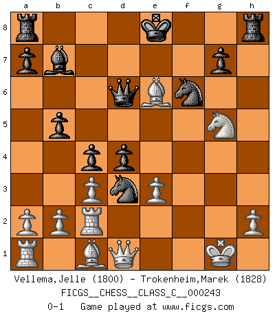 Last move : 0-1 2017 July 25 13:38:15 [Event "FICGS__CHESS__CLASS_C__000243"] [Site "FICGS"] [Date "2017.06.17"] [Round "1"] [White "Vellema,Jelle"] [Black "Trokenheim,Marek"] [Result "0-1"] [WhiteElo "1800"] [BlackElo "1828"] 1.d4 d5 2.Nf3 Nf6 3.e3 e6 4.Bd3 c5 5.Nbd2 c4 6.Be2 b5 7.c3 Bb7 8.Ne5 Bd6 9.f4 Nc6 10.O-O Ne7 11.g4 h5 12.f5 hxg4 13.fxe6 fxe6 14.Bxg4 Bxe5 15.dxe5 Qc7 16.Rf4 Qxe5 17.Nf3 Qd6 18.Ng5 Ng6 19.Rf2 Ne5 20.Bxe6 Nd3 21.Rc2 d4 0-1 Queen's pawn game Kingside Castling by player White (move 10) Player Black won this chess game. Follow this game move after move (download)For me, Chess is life and every game is like a new life. Every Chess player gets to live many lives in one lifetime. (Eduard Gufeld) Mein Name ist Rustam Kamsky. Sie haben meinen Sohn belästigt. Bereiten Sie sich aufs Sterben vor. (Rustam Kamsky) Nunca antes ha habido un jugador de Ajedrez con tal conocimiento a fondo de las complejidades del juego y una inmensa voluntad absolutamente indomable de ganar. Yo pienso que Fischer es el jugador mas grande que jamás haya existido. (Lisa Lane) Aux échecs, les retours au sommet sont rares : les dommages psychologiques consécutifs à une défaite sont trop sévères. (Daily Telegraph) Cactus - It is depressed cucumber. (Ilmars Cirulis)