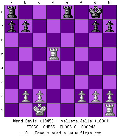 Last move : 1-0 2017 October 29 0:59:16 [Event "FICGS__CHESS__CLASS_C__000243"] [Site "FICGS"] [Date "2017.06.17"] [Round "1"] [White "Ward,David"] [Black "Vellema,Jelle"] [Result "1-0"] [WhiteElo "1845"] [BlackElo "1800"] 1.e4 e6 2.d4 d5 3.Nd2 dxe4 4.Nxe4 Nd7 5.Bd3 Ngf6 6.Qe2 c5 7.Nxf6+ Nxf6 8.dxc5 Bxc5 9.Nf3 O-O 10.Bg5 e5 11.Nxe5 Re8 12.O-O-O Qb6 13.Bc4 Be6 14.Bxf6 Bxc4 15.Qxc4 Qxf6 16.Nxf7 Qxf7 17.Qxc5 Qxa2 18.Qd5+ Qxd5 19.Rxd5 1-0 This chess game has been lost on time (started : 2017.06.17 22:6:58) French : Tarrasch Kingside Castling by player Black (move 9) Queenside Castling by player White (move 12) Player White won this chess game. Follow this game move after move (download)It is peculiar but a fact nevertheless, that gamblers in chess always have enthusiastic followers. (Botvinnik) Der Schachmeister von Heute braucht Courage, einen Killerinstinkt, Ausdauer und Arroganz. (Larry Evans) Ciertamente, de todas la drogas del mundo, el Ajedrez debe ser el mas placentero permamentemente. (Assiac) Un journaliste : 'Vous préférez avoir une dame de plus sur l'échiquier ou au lit ?' Boris Spassky : 'Ca dépend de la position.' The age of a woman doesn't mean a thing. The best tunes are played on the oldest fiddles. (Ralph Waldo Emerson)