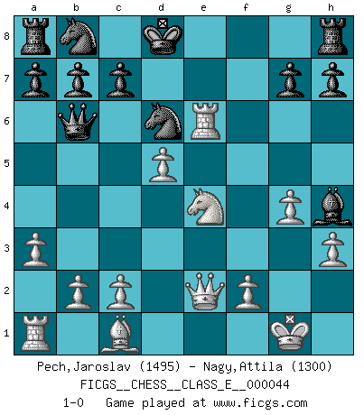 Last move : 1-0 2007 October 2 10:56:18 [Event "FICGS__CHESS__CLASS_E__000044"] [Site "FICGS"] [Date "2007.04.09"] [Round "1"] [White "Pech,Jaroslav"] [Black "Nagy,Attila"] [Result "1-0"] [WhiteElo "1495"] [BlackElo "1300"] 1.e4 d5 2.exd5 Qxd5 3.Nc3 Qa5 4.d4 Nf6 5.Nf3 Bg4 6.h3 Bh5 7.g4 Bg6 8.Ne5 e6 9.Bg2 Be4 10.Bxe4 Nxe4 11.Qf3 Nd6 12.O-O f6 13.Re1 fxe5 14.Rxe5 Qb4 15.d5 Be7 16.a3 Qb6 17.Rxe6 Kd8 18.Qe2 Bh4 19.Ne4 1-0 This chess game has been lost on time (started : 2007.04.09 1:37:12) Scandinavian defense, Lasker variation Kingside Castling by player White (move 12) Player White won this chess game. Follow this game move after move (download)Chess is in its essence a game, in its form an art, and in its execution a science. (Baron Tassilo) Ein Schachspiel besteht aus drei Phasen: Die erste, wenn du hofftst den Vorteil zu haben, die zweite, wenn du glaubst einen Vorteil zu haben, und die dritte.... wenn du weißt Du wirst verlieren. (Savielly Grigorievitsch Tartakower) En el Ajedrez, tal como en la vida, las bendiciones de hoy pueden ser el veneno del mañana. (Assaic) Vouloir jouer aux échecs contre soi-même est aussi paradoxal que vouloir marcher sur son ombre. (Stefan Zweig) Now you put water in a cup, it becomes the cup; You put water into a bottle it becomes the bottle; You put it in a teapot it becomes the teapot. Water can flow or it can crash. Be water, my friend. (Bruce Lee)