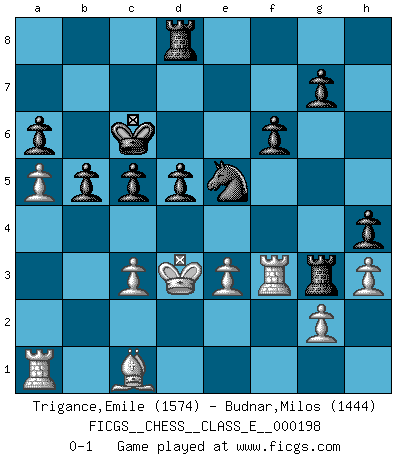Last move : 0-1 2017 September 5 16:57:21 [Event "FICGS__CHESS__CLASS_E__000198"] [Site "FICGS"] [Date "2017.06.17"] [Round "1"] [White "Trigance,Emile"] [Black "Budnar,Milos"] [Result "0-1"] [WhiteElo "1574"] [BlackElo "1444"] 1.b4 e5 2.Bb2 Bxb4 3.f4 d6 4.Nf3 Nc6 5.c3 Ba5 6.e3 Bg4 7.Be2 Qd7 8.Na3 O-O-O 9.Nc4 Nf6 10.O-O Bxf3 11.Bxf3 Bb6 12.Nxb6+ cxb6 13.f5 e4 14.Be2 h5 15.h3 Kb8 16.Bb5 d5 17.a4 a6 18.Bxc6 bxc6 19.Qb3 Qc7 20.a5 b5 21.Qb4 c5 22.Qb3 h4 23.Qd1 Qg3 24.Qe1 Qxe1 25.Rfxe1 Kb7 26.Rf1 Nh5 27.Rf2 Kc6 28.Kf1 Ng3+ 29.Ke1 f6 30.Kd1 Rh5 31.Kc2 Nxf5 32.Rf4 Nd6 33.d4 exd3+ 34.Kxd3 Nc4 35.Bc1 Rg5 36.Rf2 Rg3 37.Rf3 Ne5+ 0-1 Polish (Sokolsky) opening Queenside Castling by player Black (move 8) Kingside Castling by player White (move 10) Player Black won this chess game. Follow this game move after move (download)There is only one thing Fischer does in Chess without pleasure: to lose ! (Boris Spassky) Das Schachspiel hat wie die Liebe, die Musik, die Fähigkeit, den Menschen glücklich zu machen. Ich habe ein leises Gefühl des Bedauerns für jeden, der das Schachspiel nicht kennt, so wie ich jeden bedaure, der die Liebe nicht kennt. (Siegbert Tarrasch) Cuando tengas duda... ¡juega al Ajedrez!. (Tevis) Lorsque vous vous retrouvez devant une position atroce, ne tendez pas un ultime piège dérisoire avec l'intention d'abandonner si l'adversaire le déjoue ! Faites-vous plutôt un devoir de résister comme si votre vie en dépendait. Jouez le coup qui vous déplairait au centuple si vous étiez dans la peau de votre tortionnaire ! Fear is the path to the dark side. Fear leads to anger; anger leads to hate; hate leads to suffering. I sense much fear in you. (Master Yoda in Star Wars ep.1)