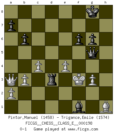 Last move : 0-1 2017 July 30 21:57:31 [Event "FICGS__CHESS__CLASS_E__000198"] [Site "FICGS"] [Date "2017.06.17"] [Round "1"] [White "Pintor,Manuel"] [Black "Trigance,Emile"] [Result "0-1"] [WhiteElo "1458"] [BlackElo "1574"] 1.e4 c5 2.Nc3 Nc6 3.g3 g6 4.d3 Bg7 5.Bg2 d6 6.f4 e6 7.Nf3 Nge7 8.O-O O-O 9.Be3 Nd4 10.Rb1 Rb8 11.Ne2 Nxf3+ 12.Bxf3 b6 13.c3 Bb7 14.d4 cxd4 15.Bxd4 e5 16.fxe5 dxe5 17.Bxe5 Bxe5 18.Qb3 Qc7 19.Rbc1 Nc6 20.Nd4 Qe7 21.Nxc6 Bxc6 22.Rfe1 Rbd8 23.Rcd1 Qg5 24.Kg2 h5 25.Qc2 h4 26.Qf2 Kg7 27.Rxd8 Rxd8 28.Re2 hxg3 29.hxg3 Bb5 30.Rc2 Bf4 31.b3 Bd3 32.Rb2 Bc1 33.c4 Bxb2 34.Qxb2+ Kg8 35.Qa3 Qd2+ 36.Kh3 Bf1+ 37.Kg4 f6 38.Bh1 Qg5+ 39.Kf3 Rd3+ 0-1 Sicilian : Closed Kingside Castling by player White (move 8) Kingside Castling by player Black (move 8) Player Black won this chess game. Follow this game move after move (download)I believe that Chess possesses a magic that is also a help in advanced age. A rheumatic knee is forgotten during a game of Chess and other events can seem quite unimportant in comparison with a catastrophe on the chessboard. (Vlastimil Hort) Sie bekommen vielleicht den Eindruck, dass die Spitzenspieler überhaupt gar nicht so stark sind. Aber das stimmt nicht. Es ist eine Illusion. Mit einem Computer an der Seite ist es sehr leicht, Urteile zu fällen, aber wenn man alleine am Brett sitzt, sieht die Sache ganz anders aus. (Vladimir Kramnik) Solo existe una cosa que Fischer hace en el Ajedrez sin placer: ¡perder!. (Boris Spassky) Je fais ceci parce que dans cinquante coups j'obtiendrai cela; je m'appelle Mikhail Moisevitch Botvinnik. (Botvinnik) Experiences are the keys to life. (Daniel Parmet)