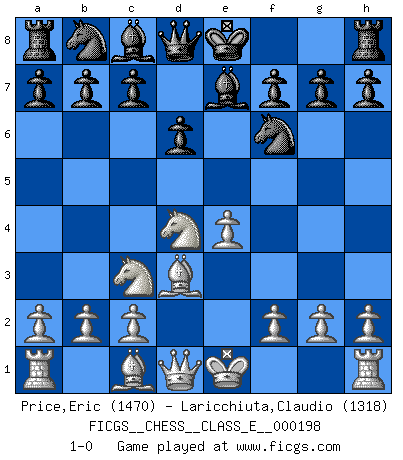 Last move : 1-0 2017 July 30 0:50:49 [Event "FICGS__CHESS__CLASS_E__000198"] [Site "FICGS"] [Date "2017.06.17"] [Round "1"] [White "Price,Eric"] [Black "Laricchiuta,Claudio"] [Result "1-0"] [WhiteElo "1470"] [BlackElo "1318"] 1.e4 e5 2.Nf3 d6 3.d4 exd4 4.Nxd4 Nf6 5.Nc3 Be7 6.Bd3 1-0 This chess game has been lost on time (started : 2017.06.17 23:7:29) Philidor : Exchange variation Player White won this chess game. Follow this game move after move (download)All my games are real. (Bobby Fischer) Ein Springer auf f6 gegen die eigene Rochadestellung ist schlimmer als ein rostiger Nagel im Knie. (Efim Bogoljubov) El juego de Fischer siempre fue nítido, racional y brillante. Uno de los mejores por siempre. (Dave Regis) A chaque perte on perd un peu de soi. (Joël Lautier) The bottom line is always the bottom line. (Johann Piek)