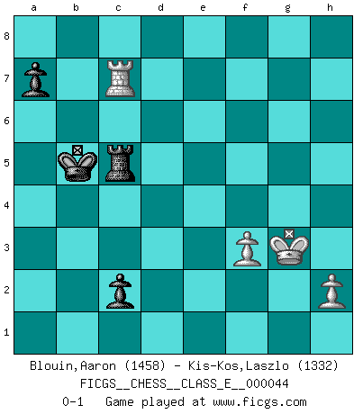 Last move : 0-1 2007 May 21 22:22:49 [Event "FICGS__CHESS__CLASS_E__000044"] [Site "FICGS"] [Date "2007.04.09"] [Round "1"] [White "Blouin,Aaron"] [Black "Kis-Kos,Laszlo"] [Result "0-1"] [WhiteElo "1458"] [BlackElo "1332"] 1.e4 e5 2.Nf3 Nc6 3.Nc3 Nf6 4.Bc4 Nxe4 5.Nxe4 d5 6.Bxd5 Qxd5 7.Qe2 Bf5 8.d3 O-O-O 9.Nc3 Bb4 10.O-O Bxc3 11.bxc3 e4 12.dxe4 Bxe4 13.Be3 Bxf3 14.Qxf3 Qxf3 15.gxf3 Ne5 16.Kg2 Nc4 17.Rab1 Nxe3+ 18.fxe3 Rd2+ 19.Rf2 Rhd8 20.Rb4 Rxf2+ 21.Kxf2 Rd2+ 22.Kg3 Rxc2 23.e4 Rxc3 24.e5 c5 25.Rf4 Re3 26.Rxf7 Rxe5 27.Rxg7 c4 28.Rxh7 c3 29.Rh4 b5 30.a4 c2 31.Rh8+ Kb7 32.Rh7+ Ka6 33.axb5+ Kxb5 34.Rc7 Rc5 0-1 Four knights : Italian variation Queenside Castling by player Black (move 8) Kingside Castling by player White (move 10) 10 pieces endgame at move 28 : White KRPPP , Black KRPPP WHITE : King + 1 Rook 3 Pawns BLACK : King + 1 Rook 3 Pawns 9 pieces endgame at move 33 : White KRPPP , Black KRPP WHITE : King + 1 Rook 3 Pawns BLACK : King + 1 Rook 2 Pawns 8 pieces endgame at move 33 : White KRPP , Black KRPP WHITE : King + 1 Rook 2 Pawns BLACK : King + 1 Rook 2 Pawns Player Black won this chess game. Follow this game move after move (download)Chess is like life. (Boris Spassky) Ja, ich habe einmal eine Blitzpartie gespielt, es war in einem Zug, 1929. --im Interview 1989 (Mikhail Moiseyevich Botvinik) Dejen al perfeccionista jugar por correo. (Yasser Seirawan) Les échecs, c'est l'imagination. (David Bronstein) See no evil, hear no evil, speak no evil. (The 3 monkeys)