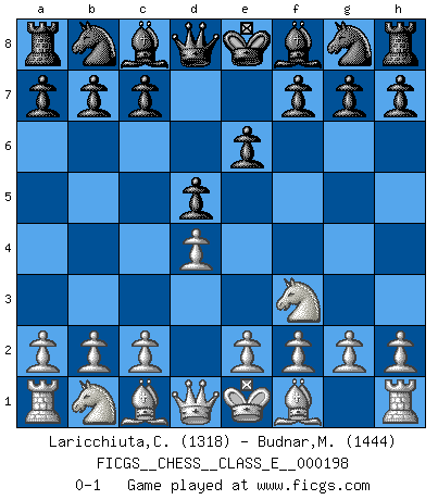 Last move : 0-1 2017 August 23 16:40:49 [Event "FICGS__CHESS__CLASS_E__000198"] [Site "FICGS"] [Date "2017.06.17"] [Round "1"] [White "Laricchiuta,Claudio"] [Black "Budnar,Milos"] [Result "0-1"] [WhiteElo "1318"] [BlackElo "1444"] 1.d4 d5 2.Nf3 e6 0-1 This chess game has been lost on time (started : 2017.06.17 23:7:29) Queen's pawn game Player Black won this chess game. Follow this game move after move (download)Openings teach you openings. Endgames teach you chess ! (Stephan Gerzadowicz) Es ist besser die Steine des Gegners zu opfern. (Savielly Grigorievitsch Tartakower) Si el Ajedrez es una ciencia, es la mas inexacta. Si el Ajedrez es un arte, es demasiado inexacto para ser visto como tal. Si el Ajedrez es un deporte, es demasiado esotérico. Si el Ajedrez es un juego, es demasiado exigente para ser solo un juego. Si el Ajedrez es una aventura, es una muy demandante. Si el Ajedrez es una pasión, es una muy gratificante. Si el Ajedrez es la vida, es una muy triste. (Anónimo) Si je n'étais pas joueur d'échecs, je serais le meilleur dans quelque chose d'autre. (Anatoli Karpov) You must do what you feel is right... of course. (Obi-Wan Kenobi in Star Wars ep.4)