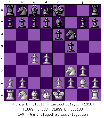 Last move : 1-0 2017 July 31 12:57:33 [Event "FICGS__CHESS__CLASS_E__000198"] [Site "FICGS"] [Date "2017.06.17"] [Round "1"] [White "Archip,Laurentiu"] [Black "Laricchiuta,Claudio"] [Result "1-0"] [WhiteElo "1531"] [BlackElo "1318"] 1.d4 e6 2.c4 f5 3.Nf3 Nf6 4.g3 Be7 5.Bg2 1-0 This chess game has been lost on time (started : 2017.06.17 23:7:29) Queen's pawn Player White won this chess game. Follow this game move after move (download)Chess is a matter of delicate judgment, knowing when to punch and how to duck. (Bobby Fischer) Man kann eine Schachpartie nur gewinnen, wenn das Gleichgewicht gestört ist. In einer Stellung mit ungestörtem Gleichgewicht ist auch das größte Genie hilflos - in der Stellung steckt dann eben kein genialer Einfall. (Wilhelm Steinitz) Yo siempre he tenido un ligero sentimiento de lástima por una persona que no tiene conocimiento del Ajedrez. (Siegbert Tarrasch) J'apprécie les joueurs d'est-indienne, c'est grâce à eux que je nourris ma famille depuis tant d'années. (Petrosian) Two beer, or not two beer. (Unknown)