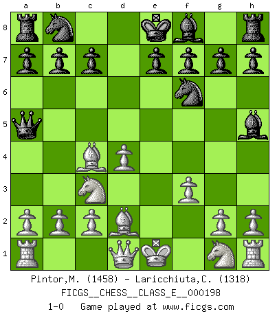Last move : 1-0 2017 July 29 12:48:14 [Event "FICGS__CHESS__CLASS_E__000198"] [Site "FICGS"] [Date "2017.06.17"] [Round "1"] [White "Pintor,Manuel"] [Black "Laricchiuta,Claudio"] [Result "1-0"] [WhiteElo "1458"] [BlackElo "1318"] 1.e4 d5 2.exd5 Qxd5 3.Nc3 Qa5 4.d4 Nf6 5.Bd2 Bg4 6.f3 Bh5 7.Bc4 1-0 This chess game has been lost on time (started : 2017.06.17 23:7:29) Scandinavian (centre counter) defense Player White won this chess game. Follow this game move after move (download)Everything is in a state of flux, and this includes the world of Chess. (Mikhail Botvinnik) Bobby Fischer ist kein Vorbild für die heutige Jugend. (Viktor Kortschnoi) Una partida de Ajedrez se divide en 3 etapas: la primera cuando piensas que tienes la ventaja, la segunda cuando crees que tienes la ventaja y la tercera... ¡cuando te das cuenta que vas a perder!. (Savielly Tartakower) Les pièces de l'échiquier étaient impitoyables. Elles le retenaient, elles l'absorbaient. Il y avait de l'horreur en cela, mais aussi une harmonie unique. Car, qu'y a-t-il dans le monde, à part les échecs ? (V. Nabokov) The weakness of an artist is dogma. (Josh Waitzkin)