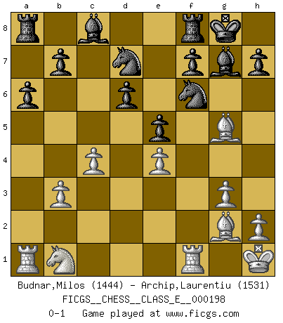 Last move : 0-1 2017 August 18 20:29:45 [Event "FICGS__CHESS__CLASS_E__000198"] [Site "FICGS"] [Date "2017.06.17"] [Round "1"] [White "Budnar,Milos"] [Black "Archip,Laurentiu"] [Result "0-1"] [WhiteElo "1444"] [BlackElo "1531"] 1.e4 c5 2.Nf3 g6 3.d4 Bg7 4.c4 cxd4 5.Nxd4 a6 6.g3 e5 7.Nf5 gxf5 8.Bg2 d6 9.O-O Nf6 10.f3 fxe4 11.fxe4 O-O 12.Bg5 Qb6+ 13.Kh1 Qxb2 14.Qb3 Qxb3 15.axb3 Nbd7 0-1 Sicilian : Hungarian variation Kingside Castling by player White (move 9) Kingside Castling by player Black (move 11) Player Black won this chess game. Follow this game move after move (download)When you are lonely, when you feel yourself an alien in the world, play Chess. This will raise your spirits and be your counselor in war. (Aristotle) Wie bekannt hörte Morphy 1859 auf, Schach zu spielen. Seine Enttäuschung galt nicht so sehr dem Schach, wie den Schachspielern. (Robert James Fischer) Siempre es mucho mejor sacrificar las piezas de tu oponente. (Savielly Tartakover) On peut tirer plus d'utilité d'une partie perdue que de 100 parties gagnées. (Capablanca) There are 10 types of people in this world: those who understand binary and those who don't. (Anonymous)