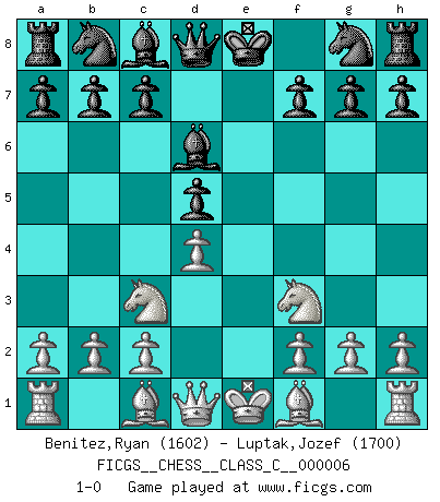 Last move : 1-0 2006 July 14 13:46:46 [Event "FICGS__CHESS__CLASS_C__000006"] [Site "FICGS"] [Date "2006.05.31"] [Round "1"] [White "Benitez,Ryan"] [Black "Luptak,Jozef"] [Result "1-0"] [WhiteElo "1602"] [BlackElo "1700"] 1.d4 e6 2.e4 d5 3.exd5 exd5 4.Nf3 Bd6 5.Nc3 1-0 This chess game has been lost on time (started : 2006.05.31 8:2:36) Queen's pawn Player White won this chess game. Follow this game move after move (download)We like to think. (Gary Kasparov) Viele Opfer benötigen überhaupt keine konkrete Berechnung. Es genügt sich die entstehende Position kurz vorzustellen, um uns davon zu überzeugen, dass das Opfer korrekt ist. (Mikhail Nekhemyevich Tal) El Ajedrez es un mar en el cual un mosquito puede beber y un elefante puede bañarse. (Refrán Hindú) Le plus grand jeu de l'esprit jamais inventé, plus vous l'apprenez, plus vous y prenez du plaisir. (Garry Kasparov) At last I discovered the true beauty of chess. So I proposed to her. (Dinesh De Silva)