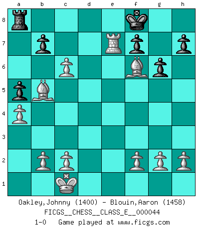 Last move : 1-0 2007 May 4 23:34:6 [Event "FICGS__CHESS__CLASS_E__000044"] [Site "FICGS"] [Date "2007.04.09"] [Round "1"] [White "Oakley,Johnny"] [Black "Blouin,Aaron"] [Result "1-0"] [WhiteElo "1400"] [BlackElo "1458"] 1.e4 d6 2.d4 Nf6 3.Nc3 e5 4.Nf3 Nc6 5.dxe5 dxe5 6.Qxd8+ Kxd8 7.Bg5 Be6 8.O-O-O Bd6 9.Bb5 Ke7 10.Nd5+ Bxd5 11.exd5 Nd4 12.Nxd4 exd4 13.Rhe1+ Kf8 14.Rxd4 a6 15.Bc4 Be7 16.a4 g6 17.Rf4 Kg7 18.Rxe7 Rhe8 19.Bxf6+ Kf8 20.Rfe4 a5 21.Bb5 Rxe7 22.Rxe7 c6 23.dxc6 1-0 Pirc defense Queenside Castling by player White (move 8) Player White won this chess game. Follow this game move after move (download)By this measure (on the gap between Fischer & his contemporaries), I consider him the greatest world champion. (Garry Kasparov) Das Blackmar-Diemer-Gambit verändert den ganzen Menschen! (Emil Joseph Diemer) Me gusta decir que Bobby Fischer fue el mejor jugador que jamás haya existido. Pero lo que hizo de Fischer un genio, fue su habilidad de mezclar una frescura y pragmatismo Americano con ideas Rusas acerca de la estrategia. (Bruce Pandolfini) En blitz, le Cavalier l'emporte sur le Fou. (Vlastimil Hort) Drag your thoughts away from your troubles... by the ears, by the heels, or any other way you can manage it. (Mark Twain)