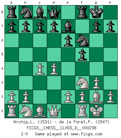 Last move : 1-0 2017 August 4 13:25:47 [Event "FICGS__CHESS__CLASS_D__000238"] [Site "FICGS"] [Date "2017.06.20"] [Round "1"] [White "Archip,Laurentiu"] [Black "de la Foret,Fred"] [Result "1-0"] [WhiteElo "1531"] [BlackElo "1547"] 1.d4 f5 2.c4 Nf6 3.Nf3 e6 4.g3 Be7 5.Bg2 O-O 6.O-O 1-0 This chess game has been lost on time (started : 2017.06.20 0:12:58) Dutch defense Kingside Castling by player Black (move 5) Kingside Castling by player White (move 6) Player White won this chess game. Follow this game move after move (download)There are two types of sacrifices: correct ones and mine. (Mikhail Tal) Wenn ich gewinne bin ich ein Genie. Wenn nicht, dann bin ich keines. (Robert James Fischer) Hoy en día, si tu no eres un Gran Maestro a los 14 años, es mejor que lo olvides. (Anand Viswanathan) Les échecs sont plus proches de l'art de l'assassinat que de l'art de la guerre. (Arturo Perez-Reverte) Either move or be moved. (Ezra Pound)