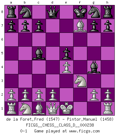 Last move : 0-1 2017 July 31 12:57:33 [Event "FICGS__CHESS__CLASS_D__000238"] [Site "FICGS"] [Date "2017.06.20"] [Round "1"] [White "de la Foret,Fred"] [Black "Pintor,Manuel"] [Result "0-1"] [WhiteElo "1547"] [BlackElo "1458"] 1.e4 e5 2.f4 Bc5 3.Nf3 d6 4.Bc4 Bg4 5.fxe5 dxe5 6.Bxf7+ Kf8 0-1 This chess game has been lost on time (started : 2017.06.20 0:12:58) KGD : Classical variation Player Black won this chess game. Follow this game move after move (download)First-class players lose to second-class players because second-class players sometimes play a first-class game. (Siegbert Tarrasch) Schach sollte überall auf der Welt Schulfach werden. Es fördert die geistige Auseinandersetzung. Es lehrt die Demut in der Niederlage. (Garry Kasparov) El jugador táctico debe saber que hacer cuando algo se debe de hacer. El estratégico debe saber que hacer cuando nada se debe de hacer. (Savielly Tartakover) Les Echecs mettent en conflit, non pas deux intelligences, mais deux volontés. (Lasker) Winning isn't everything... but losing is nothing. (Mednis)