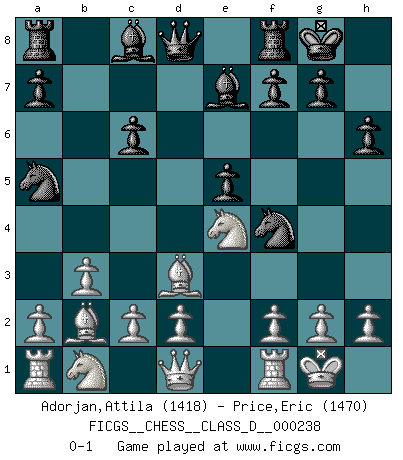 Last move : 0-1 2017 September 16 8:27:54 [Event "FICGS__CHESS__CLASS_D__000238"] [Site "FICGS"] [Date "2017.06.20"] [Round "1"] [White "Adorjan,Attila"] [Black "Price,Eric"] [Result "0-1"] [WhiteElo "1418"] [BlackElo "1470"] 1.e4 e5 2.Nf3 Nc6 3.Bc4 Nf6 4.Ng5 d5 5.exd5 Na5 6.Bb5+ c6 7.dxc6 bxc6 8.Bd3 h6 9.Ne4 Nd5 10.O-O Be7 11.b3 O-O 12.Bb2 Nf4 0-1 This chess game has been lost on time (started : 2017.06.20 0:12:58) Two knights defense Kingside Castling by player White (move 10) Kingside Castling by player Black (move 11) Player Black won this chess game. Follow this game move after move (download)Blessed be the memory of him who gave the world this immortal game. (A. G. Gardiner) Offensichtlich kennt Kasparow nichts anderes als Schach, und ich könnte 500 weitere Spieler dieser Sorte benennen. (Judith Polgar) Los asuntos humanos son como una partida de Ajedrez: solo aquellos que no lo toman seriamente, pueden ser llamados buenos jugadores. (Hung Tzu Ch'eng) Si je n'étais pas joueur d'échecs, je serais le meilleur dans quelque chose d'autre. (Anatoli Karpov) Information on the Internet is subject to the same rules and regulations as conversation at a bar. (George Lundberg)
