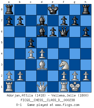 Last move : 0-1 2017 September 25 21:31:26 [Event "FICGS__CHESS__CLASS_D__000238"] [Site "FICGS"] [Date "2017.06.20"] [Round "1"] [White "Adorjan,Attila"] [Black "Vellema,Jelle"] [Result "0-1"] [WhiteElo "1418"] [BlackElo "1800"] 1.e4 e6 2.d4 d5 3.Nc3 dxe4 4.Nxe4 Nd7 5.Nf3 Ngf6 6.Nxf6+ Nxf6 7.Bg5 h6 8.Bxf6 Qxf6 9.Bd3 Bd7 10.O-O Bd6 11.c4 c5 0-1 This chess game has been lost on time (started : 2017.06.20 0:12:58) French : Rubinstein variation Kingside Castling by player White (move 10) Player Black won this chess game. Follow this game move after move (download)Fischer is completely natural. He plays no roles. He's like a child. Very, very simple. (Zita Rajcsanyi) Als ich elf wurde, wurde ich einfach gut. (Robert James Fischer) Ciertamente el estado mental actual de Bobby Fischer es una tragedia. Uno de los mas grandes jugadores de Ajedrez del mundo -el orgullo y pena del Ajedrez Americano. (Frank Brady) La tactique, c'est ce que vous faites quand il y a quelque chose à faire; la stratégie, c'est ce que vous faites quand il n'y a rien à faire. (Savielli Tartacower) Horse racing is animated roulette. (Roger Kahn)