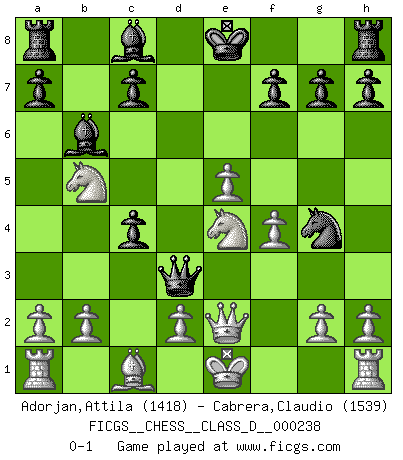 Last move : 0-1 2017 September 12 20:2:39 [Event "FICGS__CHESS__CLASS_D__000238"] [Site "FICGS"] [Date "2017.06.20"] [Round "1"] [White "Adorjan,Attila"] [Black "Cabrera,Claudio"] [Result "0-1"] [WhiteElo "1418"] [BlackElo "1539"] 1.e4 e5 2.Nf3 Nc6 3.Bc4 Nf6 4.Ng5 d5 5.exd5 Nd4 6.c3 b5 7.cxd4 bxc4 8.Qe2 Qxd5 9.dxe5 Ng4 10.f4 Qd3 11.Nc3 Bc5 12.Nge4 Bd4 13.Nb5 Bb6 0-1 This chess game has been lost on time (started : 2017.06.20 0:12:58) Two knights defense : Fritz variation Player Black won this chess game. Follow this game move after move (download)In Chess, at least, the brave inherit the earth. (Edmar Mednis) Woher wissen wir, daß der Neanderthaler Blindschach gespielt hat? -- Bei Ausgrabungen wurden keine Schachbretter und Figuren gefunden. (Anonymous) Aquellos que dicen entender al Ajedrez, no entienden nada. (Robert Hubner) Les Echecs, c'est l'art de la guerre sans les charniers, c'est la résurrection des morts tombés au champ d'honneur, l'espoir perpétuel, la suprématie de l'intelligence sur la force, la culture de l'esprit. (F. Szpiner) The large trees attract high winds. (Chinese proverb)