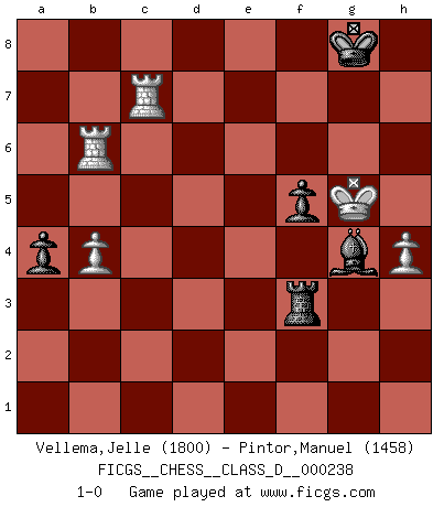 Last move : 1-0 2017 August 10 11:59:51 [Event "FICGS__CHESS__CLASS_D__000238"] [Site "FICGS"] [Date "2017.06.20"] [Round "1"] [White "Vellema,Jelle"] [Black "Pintor,Manuel"] [Result "1-0"] [WhiteElo "1800"] [BlackElo "1458"] 1.d4 d5 2.Nf3 c6 3.e3 Nf6 4.Bd3 Bg4 5.Nbd2 Nbd7 6.c4 e6 7.O-O Be7 8.Qb3 Qb6 9.Qxb6 Nxb6 10.Ne5 O-O 11.b3 h6 12.Bb2 Nbd7 13.f4 Nxe5 14.fxe5 Nh7 15.a3 Bg5 16.Rae1 Bh5 17.Bc3 a6 18.Bb4 Rfc8 19.Nf3 b6 20.Nxg5 Nxg5 21.Bd6 b5 22.c5 Ne4 23.Bxe4 dxe4 24.h4 a5 25.Rf4 Bg6 26.Ref1 a4 27.b4 h5 28.g4 Ra7 29.gxh5 Bxh5 30.Rxe4 Kh7 31.Ref4 Rg8 32.R1f2 f5 33.exf6 gxf6 34.Kh2 f5 35.Be5 Bg4 36.e4 Rf7 37.d5 cxd5 38.exd5 exd5 39.Rd4 Rd7 40.c6 Re7 41.Rxd5 Rc8 42.c7 Rxe5 43.Rxe5 Rxc7 44.Rxb5 Rc3 45.Rb6 Rxa3 46.Rc2 Kg8 47.Rc7 Ra2+ 48.Kg3 Ra3+ 49.Kf4 Rf3+ 50.Kg5 1-0 Queen's pawn game Kingside Castling by player White (move 7) Kingside Castling by player Black (move 10) 10 pieces endgame at move 45 : White KRRPP , Black KRBPP WHITE : King + 2 Rooks 2 Pawns BLACK : King + 1 Rook 1 Bishop 2 Pawns Player White won this chess game. Follow this game move after move (download)Chess problems demand from the composer the same virtues that characterize all worthwhile art: originality, invention, conciseness, harmony, complexity, and splendid insincerity. (Vladimir Nabokov) Das Schachspiel hat wie die Liebe, die Musik, die Fähigkeit, den Menschen glücklich zu machen. Ich habe ein leises Gefühl des Bedauerns für jeden, der das Schachspiel nicht kennt, so wie ich jeden bedaure, der die Liebe nicht kennt. (Siegbert Tarrasch) El Ajedrez es un regaderazo frío para la mente. (Sir John Simon) Les Cavaliers se révèlent fort utiles dans les positions fermées. D'habitude, les Fous sont un peu plus forts que les Cavaliers dans les positions ouvertes. Qu'on le veuille ou non, il restera toujours des exceptions ! Beep ! (R2D2 in Star Wars ep.3)