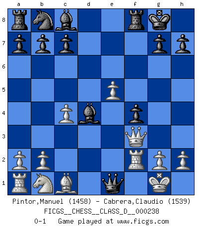Last move : 0-1 2017 June 29 12:50:16 [Event "FICGS__CHESS__CLASS_D__000238"] [Site "FICGS"] [Date "2017.06.20"] [Round "1"] [White "Pintor,Manuel"] [Black "Cabrera,Claudio"] [Result "0-1"] [WhiteElo "1458"] [BlackElo "1539"] 1.e4 e5 2.f4 exf4 3.Nf3 Be7 4.Bc4 Nf6 5.Bxf7+ Kxf7 6.e5 Ng4 7.O-O Rf8 8.d4 Kg8 9.c4 d6 10.Qb3 dxe5 11.dxe5 Bc5+ 12.Kh1 Nf2+ 13.Kg1 Qd3 14.Rxf2 Qe2 15.Nd4 Bxd4 16.Qf3 Qe1+ 0-1 KGA : Cunningham, Euwe defense Kingside Castling by player White (move 7) Player Black won this chess game. Follow this game move after move (download)Chess is so inspiring that I do not believe a good player is capable of having an evil thought during the game. (Wilhelm Steinitz) Kombinieren und Schwarzhandel gehören verboten. (Savielly Grigorievitsch Tartakower) ¡Examina movidas que hagan daño! Un buen ojo for movidas desvastantes es mucho mas importante que el conocimiento de principios estratégicos. (Purdy) Si rien de grave n'est détecté lors de l'analyse d'une position, on joue alors le coup. Seconde règle de Blumenfeld. You must have a dream in order to have it come true. (A.P.J. Kalam)
