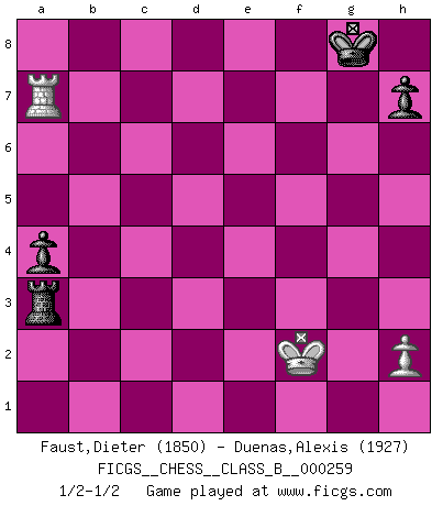 Last move : 1/2-1/2 2017 August 3 12:46:14 [Event "FICGS__CHESS__CLASS_B__000259"] [Site "FICGS"] [Date "2017.06.20"] [Round "1"] [White "Faust,Dieter"] [Black "Duenas,Alexis"] [Result "1/2-1/2"] [WhiteElo "1850"] [BlackElo "1927"] 1.c4 e5 2.Nc3 Nc6 3.g3 Nf6 4.Nf3 g6 5.Bg2 Bg7 6.d4 exd4 7.Nxd4 O-O 8.O-O Re8 9.Nxc6 dxc6 10.Bf4 Qe7 11.Qc2 Be6 12.Qb3 Reb8 13.Rfd1 Ng4 14.Rac1 g5 15.Bd2 f5 16.Na4 b5 17.Nc3 f4 18.gxf4 gxf4 19.Bxf4 Rf8 20.Nd5 Qf7 21.Bg3 Nxf2 22.Rf1 bxc4 23.Qxc4 Bxd5 24.Qc5 Nh3+ 25.Bxh3 Qg6 26.Bg2 Bxg2 27.Kxg2 Qe4+ 28.Rf3 Qxe2+ 29.Qf2 Qe6 30.Rc5 Rad8 31.Rxf8+ Rxf8 32.Qc2 Qxa2 33.b3 Qxc2+ 34.Rxc2 Rb8 35.Rxc6 Rxb3 36.Rxc7 Bd4 37.Rd7 Bb6 38.Bb8 a5 39.Ba7 Bxa7 40.Rxa7 Ra3 41.Kf2 a4 1/2-1/2 English : Sicilian Reversed Kingside Castling by player Black (move 7) Kingside Castling by player White (move 8) 10 pieces endgame at move 35 : White KRBP , Black KRBPPP WHITE : King + 1 Rook 1 Bishop 1 Pawn BLACK : King + 1 Rook 1 Bishop 3 Pawns 9 pieces endgame at move 36 : White KRBP , Black KRBPP WHITE : King + 1 Rook 1 Bishop 1 Pawn BLACK : King + 1 Rook 1 Bishop 2 Pawns 8 pieces endgame at move 39 : White KRP , Black KRBPP WHITE : King + 1 Rook 1 Pawn BLACK : King + 1 Rook 1 Bishop 2 Pawns 7 pieces endgame at move 40 : White KRP , Black KRPP WHITE : King + 1 Rook 1 Pawn BLACK : King + 1 Rook 2 Pawns This chess game ended in a draw. Follow this game move after move (download)Combinations have always been the most intriguing aspect of Chess. The masters look for them, the public applauds them, the critics praise them. It is because combinations are possible that Chess is more than a lifeless mathematical exercise. They are the poetry of the game; they are to Chess what melody is to music. They represent the triumph of mind over matter. (Reuben Fine) Dein Körper muss in Topform sein. Dein Schach verfällt, wenn dein Körper verfällt. Der Körper kann nicht vom Geist getrennt werden. (Robert James Fischer) Un juego de Ajedrez es un dialogo, una conversación entre un jugador y su oponente. Cada movimiento del oponente puede contener amenazas o tropiezos, pero un jugador no se puede defender de las amenazas o tomar ventaja de los tropiezos si es que no se pregunta a sí mismo: ¿Que es lo que mi oponente va a hacer después de cada movida?. (Bruce A. Moon) Plusieurs personnes se sont demandées comment Tal faisait pour gagner... En fait, c'est très simple ! Il met ses pièces au centre de l'échiquier et les sacrifie quelque part ! (David Bronstein) There are lots of people who mistake their imagination for their memory. (Josh Bilings)