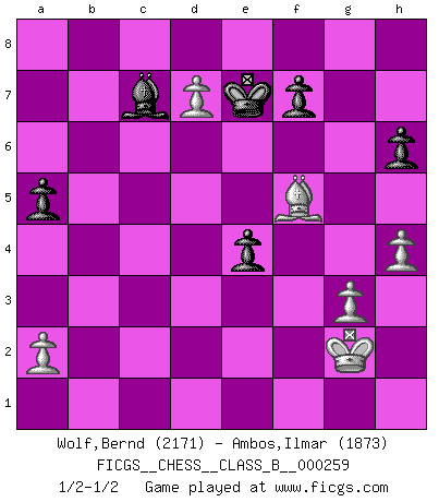 Last move : 1/2-1/2 2017 October 13 16:35:12 [Event "FICGS__CHESS__CLASS_B__000259"] [Site "FICGS"] [Date "2017.06.20"] [Round "1"] [White "Wolf,Bernd"] [Black "Ambos,Ilmar"] [Result "1/2-1/2"] [WhiteElo "2171"] [BlackElo "1873"] 1.f4 Nf6 2.Nf3 d5 3.g3 g6 4.Bg2 Bg7 5.O-O O-O 6.d3 c5 7.c3 Nc6 8.Na3 Rb8 9.Ne5 Qc7 10.Nxc6 Qxc6 11.Qc2 b5 12.e4 dxe4 13.dxe4 e5 14.f5 Rd8 15.Bg5 h6 16.Bxf6 Qxf6 17.fxg6 Qxg6 18.Rad1 Rxd1 19.Qxd1 Qb6 20.Nc2 Be6 21.Ne3 c4 22.Qe2 b4 23.Bf3 Qa5 24.cxb4 Qxb4 25.Rf2 c3 26.bxc3 Qxc3 27.Kg2 Rb1 28.Qd2 Qxd2 29.Rxd2 Rb4 30.Nd5 Ra4 31.Ne7+ Kf8 32.Nd5 a5 33.h4 Rd4 34.Rf2 Rc4 35.Nb6 Rb4 36.Nd5 Bxd5 37.exd5 e4 38.Bh5 Rb2 39.Rxb2 Bxb2 40.d6 Be5 41.d7 Ke7 42.Bg4 Bc7 43.Bf5 1/2-1/2 Bird's Opening Kingside Castling by player White (move 5) Kingside Castling by player Black (move 5) This chess game ended in a draw. Follow this game move after move (download)I'd rather have a Pawn than a finger. (Reuben Fine) Ich habe die besten Aussichten, den ersten Preis zu gewinnen - denn jeder muss gegen Steinitz spielen, nur ich nicht! (Wilhelm Steinitz) Yo creo que el Ajedrez posee una magia que es también una ayuda en la edad avanzada. Una rodilla reumática es olvidada durante una partida de Ajedrez y otros eventos pueden parecer algo sin importancia comparada a una catástrofe en el tablero de Ajedrez. (Vlastimil Hort) Les échecs sont utiles à l'exercice de la faculté de penser et à celle de l'imagination. Car nous devons posséder une méthode élaborée pour atteindre des buts partout où nous devons conduire notre raison. (Leibnitz) Big Chess is a place for big hallucinations. (Thibault de Vassal)