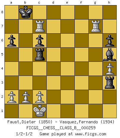 Last move : 1/2-1/2 2018 January 20 14:47:55 [Event "FICGS__CHESS__CLASS_B__000259"] [Site "FICGS"] [Date "2017.06.20"] [Round "1"] [White "Faust,Dieter"] [Black "Vasquez,Fernando"] [Result "1/2-1/2"] [WhiteElo "1850"] [BlackElo "1934"] 1.e4 e5 2.Nf3 Nf6 3.d4 exd4 4.e5 Ne4 5.Qe2 Nc5 6.Nxd4 Nc6 7.Nxc6 dxc6 8.Nc3 Bf5 9.g4 Bd7 10.h4 h5 11.gxh5 Bf5 12.Bg5 Qd7 13.Bg2 a6 14.Bf3 Ne6 15.Be4 Nd4 16.Qd3 Bg4 17.h6 f5 18.exf6 gxh6 19.Be3 O-O-O 20.Qxd4 Qxd4 21.Bxd4 Rxd4 22.f3 Bh5 23.Ne2 Rd6 24.Ng3 Bf7 25.Bf5+ Kb8 26.Ne4 Rd5 27.Bh3 Bc5 28.Nxc5 Rxc5 29.O-O-O Rf8 30.Rhg1 Bh5 31.Rg7 Rxf6 32.R1d7 Rxf3 33.Rxc7 Rxh3 34.Rxb7+ Kc8 35.Rbc7+ Kb8 1/2-1/2 Petrov : Modern attack, Bardeleben variation Queenside Castling by player Black (move 19) Queenside Castling by player White (move 29) This chess game ended in a draw. Follow this game move after move (download)In a gambit you give up a Pawn for the sake of getting a lost game. (Samuel Standige Boden) Sehr viele beherrschen heutzutage das große Einmalseins des Schachspiels und kennen sogar dessen Logarithmentafeln auswendig - deshalb sollte man hin und wieder zu beweisen trachten, dass zwei mal zwei auch fünf sein kann. (Mikhail Nekhemyevich Tal) Un mal día en el Ajedrez, es mejor que cualquier buen día en el trabajo. (Anonymous) Les échecs c'est le défi de l'alpiniste, toujours plus haut, prêt à tout pour monter à l'assaut du Roi ennemi. Les échecs, c'est de la musique en mouvement, un ballet majestueux pour les yeux. C'est de la poésie composée par les fantômes du passé qui au même titre que Rimbaud ou Verlaine méritent notre admiration. Les échecs, c'est de la peinture ou le moindre mouvement modifie le tableau pour en faire un Picasso ou un Van Gogh. Les échecs, c'est tout et rien, c'est la vie et la mort. Jjulie33 sur le forum de France-Echecs. Computers are like Old Testament gods; lots of rules and no mercy. (Joseph Campbell)