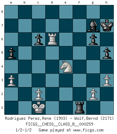 Last move : 1/2-1/2 2017 October 13 17:56:58 [Event "FICGS__CHESS__CLASS_B__000259"] [Site "FICGS"] [Date "2017.06.20"] [Round "1"] [White "Rodriguez Perez,Rene"] [Black "Wolf,Bernd"] [Result "1/2-1/2"] [WhiteElo "1903"] [BlackElo "2171"] 1.e4 c5 2.Nf3 Nc6 3.Bb5 g6 4.Bxc6 dxc6 5.d3 Bg7 6.h3 Nf6 7.Nc3 Nd7 8.Be3 b6 9.Qd2 h6 10.a4 a5 11.Nh2 e5 12.O-O-O Nf8 13.f4 exf4 14.Bxf4 Ne6 15.Nf3 Nxf4 16.Qxf4 O-O 17.e5 b5 18.Qe3 Qb6 19.Ne4 bxa4 20.Qxc5 Qb7 21.Qa3 Qb4 22.Rhe1 Be6 23.Nc5 Bd5 24.d4 Rfd8 25.e6 Qxa3 26.exf7+ Kxf7 27.bxa3 Bxf3 28.Rf1 Rxd4 29.Rxf3+ Kg8 30.Rxd4 Bxd4 31.Nxa4 h5 32.Rd3 Bg7 33.Rd6 Kh7 34.Nc5 Rf8 35.Ne4 Rf1+ 1/2-1/2 Sicilian : Nimzovich-Rossolimo attack (with ...g6, without ...d6) Queenside Castling by player White (move 12) Kingside Castling by player Black (move 16) This chess game ended in a draw. Follow this game move after move (download)You need not play well - just help your opponent to play badly. (Genrikh Chepukaitis) Offensichtlich kennt Kasparow nichts anderes als Schach, und ich könnte 500 weitere Spieler dieser Sorte benennen. (Judith Polgar) A través de las casillas del tablero, los Indios explican el movimiento del tiempo y la edad, las influencias mas altas que controlan el mundo y los lazos que vinculan al Ajedrez con el alma humana. (Al-Masudi) Les sacrifices démontrent seulement que quelqu'un a gaffé. (Savielly Tartacover) Man with more than one clock never knows what time it is. (Chinese thought)