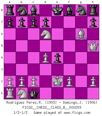 Last move : 1/2-1/2 2017 July 14 23:57:12 [Event "FICGS__CHESS__CLASS_B__000259"] [Site "FICGS"] [Date "2017.06.20"] [Round "1"] [White "Rodriguez Perez,Rene"] [Black "Domingo,Jordi"] [Result "1/2-1/2"] [WhiteElo "1903"] [BlackElo "1906"] 1.e4 e5 2.Nf3 f5 3.Bc4 fxe4 4.Nxe5 Qg5 5.d4 Qxg2 6.Qh5+ g6 7.Bf7+ Kd8 8.Bxg6 Qxh1+ 9.Ke2 Qxc1 10.Nf7+ Ke8 11.Nd6+ Kd8 12.Nf7+ Ke8 13.Nd6+ 1/2-1/2 Latvian gambit, 3.Bc4 This chess game ended in a draw. Follow this game move after move (download)Who is your opponent tonight, tonight I am playing against the Black pieces. (Akiba Rubinstein) Jeder weiß, dass Gasprom Putins persönliches Machtinstrument ist. Die Firma wird vom Kreml aus geleitet und wird schon deshalb nie transparent sein. (Garry Kasparov) Las Aperturas te enseñan aperturas. ¡Los Finales te enseñan Ajedrez!. (Stephan Gerzadowicz) Le jeu d'échecs fait naître et fortifie en nous plusieurs qualités précieuses dans le cours de l'existence, telles que la prévoyance, la circonspection, la prudence, et la persévérance. (Benjamin Franklin - 1783, la morale des échecs) The quality of decision is like the well-timed swoop of a falcon which enables it to strike and destroy its victim. (Sun Tzu)