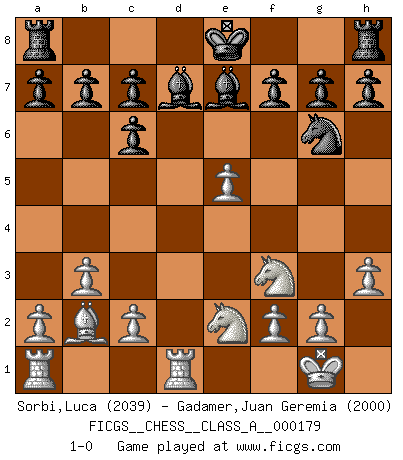 Last move : 1-0 2017 October 8 16:41:12 [Event "FICGS__CHESS__CLASS_A__000179"] [Site "FICGS"] [Date "2017.06.20"] [Round "1"] [White "Sorbi,Luca"] [Black "Gadamer,Juan Geremia"] [Result "1-0"] [WhiteElo "2039"] [BlackElo "2000"] 1.e4 e5 2.Nf3 Nc6 3.Bb5 Nf6 4.O-O Nxe4 5.d4 Nd6 6.Bxc6 dxc6 7.dxe5 Nf5 8.Qxd8+ Kxd8 9.Rd1+ Ke8 10.Nc3 Ne7 11.h3 Ng6 12.b3 Be7 13.Ne2 Bd7 14.Bb2 1-0 Ruy Lopez : Berlin defense, Open variation Kingside Castling by player White (move 4) Player White won this chess game. Follow this game move after move (download)Chess is a terrible game. If you have no center, your opponent has a freer position. If you do have a center, then you really have something to worry about ! (Siegbert Tarrasch) Rubinstein ist ein Turmendspiel, welches die Götter vor tausenden von Jahren begannen. (Savielly Grigorievitsch Tartakower) Debemos de asegurarnos de que el Ajedrez no se convierta en un lenguaje muerto, muy interesante, pero solo para un grupo muy pequeño. (Sytze Faber) A ce moment-là, je menaçais de comprendre la position ! (Clément L'Heureux) Be who you are, and say what you feel because those who mind don't matter, and those who matter don't mind. (Dr Seuss)