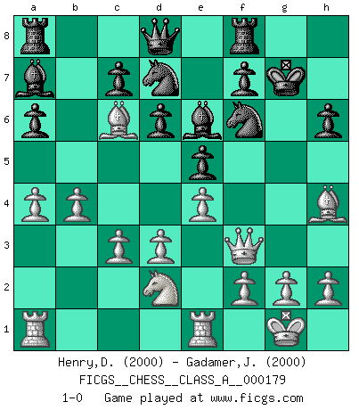 Last move : 1-0 2017 October 5 19:53:52 [Event "FICGS__CHESS__CLASS_A__000179"] [Site "FICGS"] [Date "2017.06.20"] [Round "1"] [White "Henry,Derek"] [Black "Gadamer,Juan Geremia"] [Result "1-0"] [WhiteElo "2000"] [BlackElo "2000"] 1.e4 e5 2.Nf3 Nc6 3.Bc4 Bc5 4.d3 Nf6 5.c3 d6 6.O-O O-O 7.Bg5 h6 8.Bh4 g5 9.Bg3 a6 10.a4 Kh7 11.b4 Ba7 12.Nbd2 g4 13.Bh4 gxf3 14.Qxf3 Kg7 15.Rfe1 Be6 16.Bd5 Nb8 17.Bxb7 Nbd7 18.Bc6 1-0 Giuoco Pianissimo Kingside Castling by player White (move 6) Kingside Castling by player Black (move 6) Player White won this chess game. Follow this game move after move (download)I have added these principles to the law: get the Knights into action before both Bishops are developed. (Emanuel Lasker) Schach ist ein Reich, wo sich die menschliche Phantasie frei entfalten kann. (David Bronstein) Fischer es una tragedia del Ajedrez Americano a la par con Morphy y Pillsbury. (Mig Greengard) Même si vous avez un bon coup à faire, regardez toujours s'il n'y en a pas un qui lui soit préférable. (Pedro Damiano) If only people were all showed a certain minimum level of niceness; if only people didn't retract verbal draw offers (without draw box ticked) on ficgs; if only people didn't kill; if only people didn't run concentration / extermination camps, if only people didn't drop nuclear bombs on Hiroshima and Nagasaki, and so on - it would be a much more beautiful world. But sadly, things are not so... (Normajean Yates)