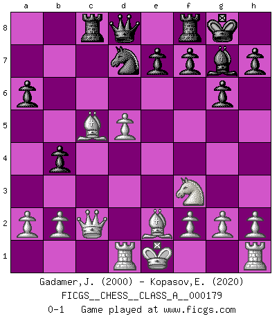 Last move : 0-1 2017 October 8 16:41:0 [Event "FICGS__CHESS__CLASS_A__000179"] [Site "FICGS"] [Date "2017.06.20"] [Round "1"] [White "Gadamer,Juan Geremia"] [Black "Kopasov,Evgeny"] [Result "0-1"] [WhiteElo "2000"] [BlackElo "2020"] 1.Nf3 Nf6 2.c4 g6 3.Nc3 d5 4.Qa4+ Bd7 5.Qb3 dxc4 6.Qxc4 a6 7.d4 b5 8.Qb3 Bg7 9.e4 c5 10.dxc5 O-O 11.Be2 Be6 12.Qc2 Nbd7 13.Be3 Rc8 14.Rd1 b4 15.Nd5 Bxd5 16.exd5 Nxc5 17.Bxc5 Nd7 0-1 Reti Opening Kingside Castling by player Black (move 10) Player Black won this chess game. Follow this game move after move (download)The stomach is an essential part of the Chess master. (Bent Larsen) Drei Punkte vor allen anderen ist wie einer, der im weißen Anzug posiert, während der Rest in Müllsäcke gekleidet dasteht. (Viktor Kortschnoi) Siempre es mejor sacrificar los hombres de tu oponente. (Savielly Tartakower) Il n'y a pas eu de défaite parce que je ne crois pas que cet ordinateur ait jamais existé. IBM a triché en refusant d'imprimer les modes de recherche de la machine. C'est évident, pendant le match, des coups décisifs ont été joués par des êtres humains. Aujourd'hui, les meilleurs spécialistes en informatique ne peuvent toujours pas expliquer comment Deep-Blue a pu jouer contre la logique des ordinateurs. IBM a gagné une guerre de communication, mais ils sont incapables de prouver que l'ordinateur a gagné tout seul. (Garry Kasparov) Thibault, I ask for draw. Game 13876. - Sorry Ilmars, you won. (FICGS chat)