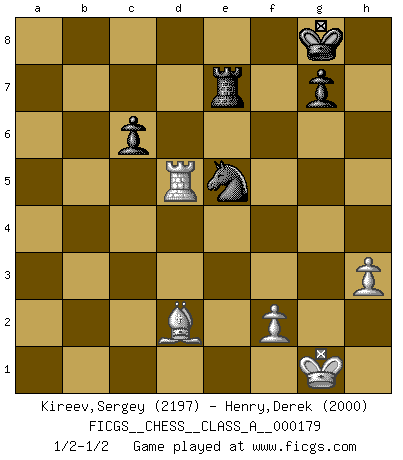 Last move : 1/2-1/2 2017 August 17 8:43:0 [Event "FICGS__CHESS__CLASS_A__000179"] [Site "FICGS"] [Date "2017.06.20"] [Round "1"] [White "Kireev,Sergey"] [Black "Henry,Derek"] [Result "1/2-1/2"] [WhiteElo "2197"] [BlackElo "2000"] 1.e4 e5 2.Nf3 Nc6 3.Bb5 Nf6 4.d3 Bc5 5.c3 O-O 6.O-O d6 7.Nbd2 Ne7 8.d4 exd4 9.cxd4 Bb6 10.Re1 Bg4 11.h3 Bh5 12.Qb3 d5 13.e5 Nd7 14.a4 a5 15.Qd1 f6 16.e6 Nb8 17.Nb3 Nbc6 18.Bxc6 Nxc6 19.Bf4 Qe7 20.Rc1 Qb4 21.g4 Bg6 22.Nc5 Bxc5 23.Rxc5 Be4 24.Re3 Qxb2 25.Rb3 Bxf3 26.e7 Rfe8 27.Qxf3 Qxd4 28.Be3 Qxa4 29.Rxb7 Kh8 30.g5 fxg5 31.Bxg5 h6 32.Bxh6 Rxe7 33.Bd2 Ne5 34.Qh5+ Kg8 35.Rxa5 Qe8 36.Qxe8+ Raxe8 37.Rxd5 c6 38.Rxe7 Rxe7 1/2-1/2 Ruy Lopez : Berlin defense Kingside Castling by player Black (move 5) Kingside Castling by player White (move 6) 10 pieces endgame at move 38 : White KRBPP , Black KRNPP WHITE : King + 1 Rook 1 Bishop 2 Pawns BLACK : King + 1 Rook 1 Knight 2 Pawns This chess game ended in a draw. Follow this game move after move (download)Many Chess players were surprised when after the game, Fischer quietly explained: 'I had already analyzed this possibility' in a position which I thought was not possible to foresee from the opening. (Mikhail Tal) Es hat in meinem Leben Zeiten gegeben, in denen das Schachspiel, wenn nicht zum Lebenszweck, so doch zu einem regelrechten Lebensersatz geworden ist. Man fühlt sich in solchen Zeiten nicht so, als besäße man eine göttliche Gabe, sondern eher so, als sei man von ihr besessen. (Garry Kasparov) EL Ajedrez es como la vida. (Boris Spassky) La tactique est l'élément le plus important du milieu de jeu. (Siegbert Tarrasch) All battles are fought by scared men who'd rather be someplace else. (John Wayne in the movie In harm's way)