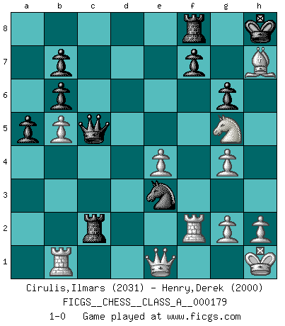 Last move : 1-0 2017 December 6 19:21:40 [Event "FICGS__CHESS__CLASS_A__000179"] [Site "FICGS"] [Date "2017.06.20"] [Round "1"] [White "Cirulis,Ilmars"] [Black "Henry,Derek"] [Result "1-0"] [WhiteElo "2031"] [BlackElo "2000"] 1.b4 e5 2.a3 d5 3.Bb2 Nd7 4.e3 a5 5.b5 Ngf6 6.d4 e4 7.c4 dxc4 8.Nd2 Nb6 9.Nxc4 Nfd5 10.Nxb6 cxb6 11.Rc1 Be6 12.Ne2 Bd6 13.Nc3 Qe7 14.Nxe4 Bxa3 15.Bxa3 Qxa3 16.Bd3 O-O 17.Ng5 Bg4 18.Bxh7+ Kh8 19.Qd2 g6 20.e4 Qb4 21.f3 Rac8 22.Ra1 Qb3 23.O-O Rc2 24.Qe1 Ne3 25.Rf2 Qb2 26.Rb1 Qxd4 27.Kh1 Qd3 28.Ra1 Qd4 29.Rb1 Qc5 30.fxg4 1-0 Polish (Sokolsky) opening Kingside Castling by player Black (move 16) Kingside Castling by player White (move 23) Player White won this chess game. Follow this game move after move (download)Bobby Fischer is the greatest Chess genius of all time ! (Alexander Kotov) Die Partien sind immer verschieden, die Interviews immer die gleichen. (Garry Kasparov) El Ajedrez no es una pizca de inferior al violín, y tenemos un gran número de violinistas profesionales. (Mikhail Botvinnik) Les Echecs, c'est l'art de la guerre sans les charniers, c'est la résurrection des morts tombés au champ d'honneur, l'espoir perpétuel, la suprématie de l'intelligence sur la force, la culture de l'esprit. (F. Szpiner) You can't play chess if you're groggy from pills. (Anatoly Karpov)
