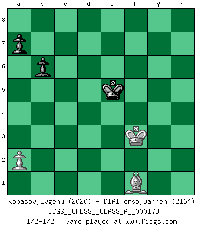 Last move : 1/2-1/2 2017 September 3 14:41:46 [Event "FICGS__CHESS__CLASS_A__000179"] [Site "FICGS"] [Date "2017.06.20"] [Round "1"] [White "Kopasov,Evgeny"] [Black "DiAlfonso,Darren"] [Result "1/2-1/2"] [WhiteElo "2020"] [BlackElo "2164"] 1.d4 Nf6 2.c4 e6 3.Nc3 Bb4 4.Qc2 O-O 5.Nf3 c5 6.dxc5 Na6 7.g3 Nxc5 8.Bg2 Nce4 9.O-O Bxc3 10.bxc3 Qc7 11.Nd4 d5 12.cxd5 exd5 13.Bf4 Qc5 14.Be3 Re8 15.Rac1 Bd7 16.c4 Rac8 17.cxd5 Qxc2 18.Rxc2 Rxc2 19.Nxc2 b6 20.d6 Nxd6 21.Nd4 Rc8 22.Rc1 Rxc1+ 23.Bxc1 Nfe4 24.Bf4 g5 25.Bxd6 Nxd6 26.f4 gxf4 27.gxf4 Be6 28.Nxe6 fxe6 29.Bc6 Kf8 30.e4 e5 31.fxe5 Nf7 32.e6 Nd8 33.Bd5 Ke7 34.Kf2 Nxe6 35.e5 Nf4 36.Bg8 Nd3+ 37.Ke3 Nxe5 38.Bxh7 Ng4+ 39.Kf4 Nxh2 40.Bd3 Kd6 41.Kg3 Nf1+ 42.Bxf1 Ke5 43.Kf3 1/2-1/2 Nimzo-Indian : Classical variation Kingside Castling by player Black (move 4) Kingside Castling by player White (move 9) 10 pieces endgame at move 34 : White KBPPP , Black KNPPP WHITE : King + 1 Bishop 3 Pawns BLACK : King + 1 Knight 3 Pawns 9 pieces endgame at move 37 : White KBPP , Black KNPPP WHITE : King + 1 Bishop 2 Pawns BLACK : King + 1 Knight 3 Pawns 8 pieces endgame at move 38 : White KBPP , Black KNPP WHITE : King + 1 Bishop 2 Pawns BLACK : King + 1 Knight 2 Pawns 7 pieces endgame at move 39 : White KBP , Black KNPP WHITE : King + 1 Bishop 1 Pawn BLACK : King + 1 Knight 2 Pawns 6 pieces endgame at move 42 : White KBP , Black KPP WHITE : King + 1 Bishop 1 Pawn BLACK : King + 2 Pawns This chess game ended in a draw. Follow this game move after move (download)It is not a move, even the best move that you must seek, but a realizable plan. (Eugene Znosko-Borovsky) Im Schach gibt es keinen Platz für Galanterie. (Irving Chernev) Cuando la partida de Ajedrez termina, el Peón y el Rey regresan a la misma caja. (Irish saying) L'action d'une oeuvre littéraire se déroule sur un champ de bataille. Les masques et les types du drame moderne correspondent aux pièces du jeu d'échecs. L'intrigue correspond aux coups et aux gambits, c'est à dire aux techniques du jeu telles qu'utilisées et interprétées par les joueurs. Les tactiques et les péripéties [mouvements] correspondent aux coups exécutés par l'adversaire. (Viktor Shklovsky) Macintosh - we might not get everything right, but at least we knew the century was going to end. (Douglas Adams)