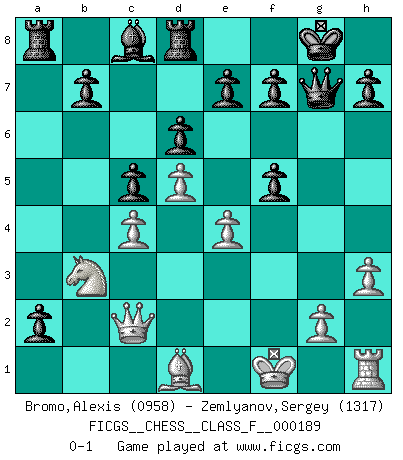 Last move : 0-1 2017 October 31 9:40:14 [Event "FICGS__CHESS__CLASS_F__000189"] [Site "FICGS"] [Date "2017.06.22"] [Round "1"] [White "Bromo,Alexis"] [Black "Zemlyanov,Sergey"] [Result "0-1"] [WhiteElo "0958"] [BlackElo "1317"] 1.d4 Nf6 2.c4 g6 3.Nc3 Bg7 4.Bf4 d6 5.e3 O-O 6.h3 c5 7.d5 Qa5 8.Be2 Ne4 9.Rc1 Nxc3 10.bxc3 Bxc3+ 11.Kf1 Bb2 12.Rc2 Qxa2 13.Nf3 a5 14.Nd2 a4 15.e4 Na6 16.Bh6 Rd8 17.f4 Nb4 18.f5 Nxc2 19.Qxc2 Qa1+ 20.Bd1 gxf5 21.Ke2 Bg7 22.Bxg7 Qxg7 23.Kf1 a3 24.Nb3 a2 0-1 King's Indian defense, 3.Nc3 Kingside Castling by player Black (move 5) Player Black won this chess game. Follow this game move after move (download)First-class players lose to second class players because second-class players sometimes play a first-class game. (Tarrasch) Die FIDE ist dabei in die Hände der russischen Mafia zu fallen. (Larry Evans) Por esta medida (el intervalo entre Fischer y sus contemporaneos), yo le considero el mas grande campeón mundial. (Garry Kasparov) Il a essayé de se convaincre qu'il pourrait empêcher toutes les erreurs et ne jamais perdre. L'horreur ! Gary Kasparov au sujet de Robert Fischer. The difference between perseverance and obstinacy is that one comes from a strong will, and the other from a strong won't. (Henry Ward Beecher)