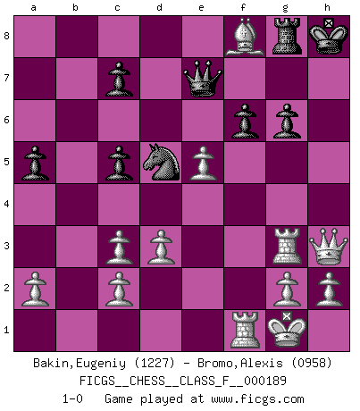 Last move : 1-0 2017 July 30 15:9:33 [Event "FICGS__CHESS__CLASS_F__000189"] [Site "FICGS"] [Date "2017.06.22"] [Round "1"] [White "Bakin,Eugeniy"] [Black "Bromo,Alexis"] [Result "1-0"] [WhiteElo "1227"] [BlackElo "0958"] 1.e4 e5 2.f4 d6 3.d3 Nf6 4.Be3 a6 5.Nf3 h6 6.fxe5 dxe5 7.Nxe5 Nc6 8.Nxc6 bxc6 9.Nc3 Bg4 10.Be2 Bxe2 11.Qxe2 Bb4 12.Bd2 a5 13.e5 Nd5 14.O-O O-O 15.Qg4 Kh8 16.Rf3 Bxc3 17.bxc3 c5 18.Rg3 Rg8 19.Rf1 Qe7 20.Qh5 Raf8 21.Bxh6 g6 22.Qh3 f6 23.Bxf8 1-0 King's gambit Kingside Castling by player White (move 14) Kingside Castling by player Black (move 14) Player White won this chess game. Follow this game move after move (download)Fischer wanted to give the Russians a taste of their own medicine. (Larry Evans) Ich kenne Menschen, die allen Willen der Welt besitzen und doch nicht Schach spielen können. (Robert James Fischer) Yo adoro todas la posiciones. Denme una partida posicional difícil, y la jugaré. Pero posiciones totalmente ganadas, no las tolero. (Hein Donner) La guerre est enfant de la passion, la passion est enfant du narcissisme et le narcissisme est l'enfant. (...) Une autre partie ? (Thibault de Vassal) I've lost money so fast in these clubs it's left me reeling. I've read every poker book ever written, but the only way to get better at the game is to go out and play with people who are really good. The problem is, you stand to lose a lot of money doing it. (Matt Damon)