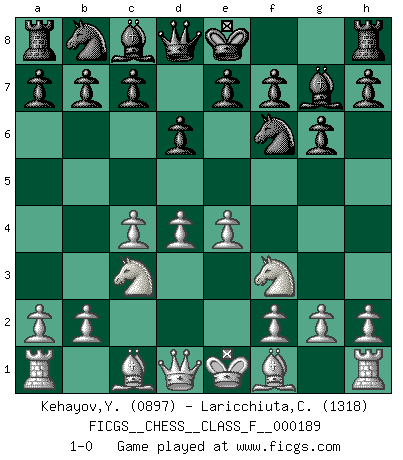 Last move : 1-0 2017 August 12 2:46:57 [Event "FICGS__CHESS__CLASS_F__000189"] [Site "FICGS"] [Date "2017.06.22"] [Round "1"] [White "Kehayov,Yulian"] [Black "Laricchiuta,Claudio"] [Result "1-0"] [WhiteElo "0897"] [BlackElo "1318"] 1.d4 Nf6 2.c4 g6 3.Nc3 Bg7 4.e4 d6 5.Nf3 1-0 This chess game has been lost on time (started : 2017.06.22 19:58:18) King's Indian : 5.Nf3 Player White won this chess game. Follow this game move after move (download)I don't believe in psychology. I believe in good moves. (Bobby Fischer) Stil? Ich habe keinen Stil! (Anatoly Karpov) Buenas posiciones no logran ganar juegos, buenas movidas sí. (Gerald Abrahams) Le profane ne songe pas à la somme de jouissance dont il se prive, qui méconnaît ce jeu aux ressources aussi variées que passionnantes. (Jean-Marie Jeanton-Lamarche) We need strong personalities and only one world champion to attract sponsors. (Anatoly Karpov)