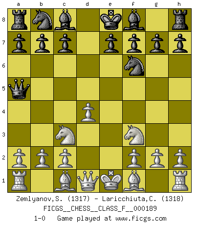 Last move : 1-0 2017 August 5 13:33:48 [Event "FICGS__CHESS__CLASS_F__000189"] [Site "FICGS"] [Date "2017.06.22"] [Round "1"] [White "Zemlyanov,Sergey"] [Black "Laricchiuta,Claudio"] [Result "1-0"] [WhiteElo "1317"] [BlackElo "1318"] 1.e4 d5 2.exd5 Qxd5 3.Nc3 Qa5 4.d4 Nf6 5.Nf3 1-0 This chess game has been lost on time (started : 2017.06.22 19:58:18) Scandinavian (centre counter) defense Player White won this chess game. Follow this game move after move (download)He who fears an isolated Queen's Pawn should give up Chess. (Siegbert Tarrasch) Ein typischer, sehr verbreiteter Gedankenschädling ist der, daß der betreffende Amateur von der Annanhme ausgeht, daß jeder einzelne Zug etwas zu leisten habe. (Aaron Nimzowitsch) El ganador de una partida es aquel jugador que hace el penúltimo error. (Savielly Tartakover) L'ordinateur a tué l'originalité. Il n'y a plus guère d'aventures sur l'échiquier. (Jacob Murray) Philosophers use a language that is already deformed as though by shoes that are too tight. (Ludwig Wittgenstein)