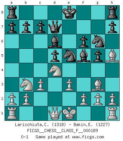Last move : 0-1 2017 September 11 19:42:28 [Event "FICGS__CHESS__CLASS_F__000189"] [Site "FICGS"] [Date "2017.06.22"] [Round "1"] [White "Laricchiuta,Claudio"] [Black "Bakin,Eugeniy"] [Result "0-1"] [WhiteElo "1318"] [BlackElo "1227"] 1.d4 e6 2.Nf3 d5 3.Bf4 Nc6 4.Nbd2 Bd6 5.Bg3 f6 6.c3 e5 7.Nb3 Bf5 8.e3 Nge7 9.Be2 g5 10.dxe5 Nxe5 11.Nfd4 Qd7 12.Bh5+ N7g6 0-1 This chess game has been lost on time (started : 2017.06.22 19:58:18) Queen's pawn Player Black won this chess game. Follow this game move after move (download)Chess is a cold bath for the mind. (Sir John Simon) Ein Isolani verdüstert die Stimmung auf dem ganzen Schachbrett. (Savielly Grigorievitsch Tartakower) El Ajedrez es el juego mas altamente simbólico, pero las agresiones estan por lo tanto aún mas francamente representadas en la partida. Tal vez comenzo como un juego de guerra; Algo como la representación de una batalla en miniatura entre las fuerzas de dos reinos. (Karl Meninger) Dans le domaine de la peinture, de la gravure et de la sculpture, dès la première décennie de notre siècle, les artistes abandonnent la représentation de la partie d'échecs pour se concentrer sur les pièces, sur les échiquiers et sur toutes les variations auxquelles les unes et les autres peuvent donner lieu. On passe en quelque sorte d'un thème social à un thème musical (au sens de la musica médiévale, c'est-à-dire d'une notion qui inclue le rythme, l'harmonie, la construction et la déconstruction, etc.). Graphiquement et picturalement, l'échiquier apparaît comme une structure ouverte, dynamique, d'une richesse infinie, autorisant toutes les combinatoires et débouchant sur des mouvements et des rythmes de nature exponentielle. (Michel Pastoureau) Man is still the most extraordinary computer of all. (John F. Kennedy)