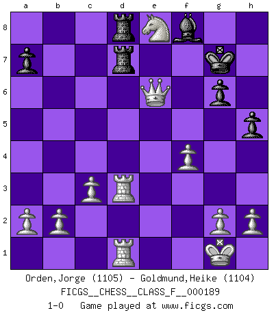 Last move : 1-0 2017 August 10 18:28:29 [Event "FICGS__CHESS__CLASS_F__000189"] [Site "FICGS"] [Date "2017.06.22"] [Round "1"] [White "Orden,Jorge"] [Black "Goldmund,Heike"] [Result "1-0"] [WhiteElo "1105"] [BlackElo "1104"] 1.e4 d5 2.exd5 Qxd5 3.d4 e5 4.c3 Nc6 5.Nf3 Bf5 6.Be2 Bd6 7.O-O Nf6 8.Bg5 Be7 9.dxe5 Ne4 10.Qxd5 Nxg5 11.Bb5 Rd8 12.Bxc6+ Bd7 13.Nxg5 Bxg5 14.Bxd7+ Rxd7 15.Qxb7 O-O 16.Na3 Rfd8 17.Nc4 c5 18.Qc6 h6 19.Nd6 Bf4 20.Qxc5 Bg5 21.f4 Be7 22.Rad1 Kf8 23.Qc6 g6 24.Rf3 h5 25.Rfd3 Kg8 26.Qc4 Bf8 27.e6 fxe6 28.Qxe6+ Kg7 29.Ne8+ 1-0 Scandinavian (centre counter) defense Kingside Castling by player White (move 7) Kingside Castling by player Black (move 15) Player White won this chess game. Follow this game move after move (download)Fischer, who may or may not be mad as a hatter, has every right to be horrified. (Jeremy Silman) Wenn ich Weiß habe gewinne ich weil ich Weiß habe, wenn ich Schwarz habe gewinne ich weil ich Bogoljubov bin. (Efim Bogoljubov) El Ajedrez es de 30 a 40 por ciento psicología. Uno no cuenta con esto cuando se juega contra una computadora. No lo puedo confundir. (Judith Polgar) J'ai toujours senti une vague pitié pour l'homme qui ne connaît rien aux échecs, tout comme j'en aurais pour un homme ignorant de l'amour. Les Echecs, comme la musique ou comme l'amour, ont le pouvoir de rendre heureux. (Siegbert Tarrasch) The difference between stupidity and genius is that genius has its limits. (Murphy)