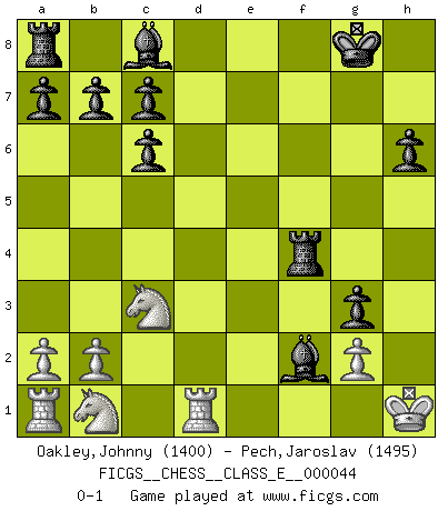 Last move : 0-1 2007 July 6 16:52:50 [Event "FICGS__CHESS__CLASS_E__000044"] [Site "FICGS"] [Date "2007.04.09"] [Round "1"] [White "Oakley,Johnny"] [Black "Pech,Jaroslav"] [Result "0-1"] [WhiteElo "1400"] [BlackElo "1495"] 1.e4 e5 2.Nf3 Nc6 3.Bb5 Bc5 4.c3 Nf6 5.O-O O-O 6.d4 Bb6 7.Bxc6 dxc6 8.Bg5 exd4 9.cxd4 h6 10.Bh4 g5 11.Bg3 Nxe4 12.Re1 Nxg3 13.hxg3 g4 14.Nfd2 Qxd4 15.Ne4 f5 16.Qxd4 Bxd4 17.Nec3 f4 18.gxf4 g3 19.Rd1 Bxf2+ 20.Kh1 Rxf4 0-1 Ruy Lopez : Classical defense, Benelux variation Kingside Castling by player White (move 5) Kingside Castling by player Black (move 5) Player Black won this chess game. Follow this game move after move (download)Chess is a terrible game. If you have no center, your opponent has a freer position. If you do have a center, then you really have something to worry about ! (Siegbert Tarrasch) Modernes Schach erfordert enorme Anspannung. Es ist für einen normalen Menschen unmöglich das auszuhalten. (Viktor Kortschnoi) La táctica fluye a partir de una posición superior. (Bobby Fischer) Demandez au pauvre Cg1 ce qu'il en pense. Eduard Gufeld à propos de la variante Saemisch de l'Est-Indienne. Chess is everything: art, science and sport. (Anatoly Karpov)