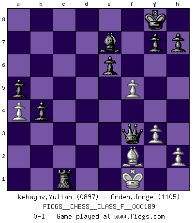 Last move : 0-1 2017 September 25 11:1:19 [Event "FICGS__CHESS__CLASS_F__000189"] [Site "FICGS"] [Date "2017.06.22"] [Round "1"] [White "Kehayov,Yulian"] [Black "Orden,Jorge"] [Result "0-1"] [WhiteElo "0897"] [BlackElo "1105"] 1.e4 c5 2.Nf3 d6 3.d4 cxd4 4.Nxd4 Nf6 5.Nc3 a6 6.Be3 e6 7.f3 Be7 8.Be2 O-O 9.O-O Nc6 10.Nxc6 bxc6 11.Na4 c5 12.Bc4 Bb7 13.b3 Qc7 14.Nb2 Rfd8 15.Qe2 Nd7 16.a4 Ne5 17.f4 Nxc4 18.Nxc4 Bxe4 19.Rac1 d5 20.Nd2 f5 21.Nxe4 fxe4 22.g3 d4 23.Bf2 a5 24.Rfd1 e3 25.Be1 Qb7 26.Qc4 Qf3 27.c3 e2 28.Bf2 d3 29.Re1 d2 30.Rxe2 dxc1Q+ 31.Re1 Rd1 32.Rxd1 Qc1xd1+ 33.Qf1 Qxf1+ 34.Kxf1 Qxc3 35.b4 cxb4 36.Be1 Qf3+ 37.Bf2 Rc8 38.f5 Rc1+ 0-1 Sicilian : Najdorf, Byrne (English) attack Kingside Castling by player Black (move 8) Kingside Castling by player White (move 9) Promotion Queen by player Black (move 30) Player Black won this chess game. Follow this game move after move (download)Up to this point White has been following well-known analysis. But now he makes a fatal error: he begins to use his own head. (Siegbert Tarrasch) Bis jetzt ist Weiß einer wohlbekannten Analyse gefolgt. Aber jetzt begeht er einen schrecklichen Fehler: Er beginnt seinen eigenen Kopf zu benutzen. (Siegbert Tarrasch) Al jugar al Ajedrez entonces, podemos aprender: Primero: Previsión... Segundo: Prudencia... Tercero: Cautela... Y al final, aprendemos del Ajedrez el hábito de no ser desanimados por apariencias malas presentes en el estado de nuestros asuntos, el hábito de la esperanza por una oportunidad favorable y la perseveración de los secretos de los recursos. (Benjamin Franklin) Vous savez, camarade Pachman, je n'éprouve pas de plaisir à être ministre, je jouerais plutôt aux échecs comme vous, ou alors ferais une révolution au Venezuela. (Che Guevara à Ludek Pachman, 'Checkmate in Prague', 1975) The message for business people contemplating their place in the cyberspace is simple and direct: get linked or get lost. (Vic Sussman and Kenan Pollack)