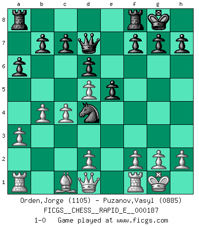Last move : 1-0 2017 August 8 20:26:23 [Event "FICGS__CHESS__RAPID_E__000187"] [Site "FICGS"] [Date "2017.06.22"] [Round "1"] [White "Orden,Jorge"] [Black "Puzanov,Vasyl"] [Result "1-0"] [WhiteElo "1105"] [BlackElo "0885"] 1.e4 e5 2.Nf3 Nc6 3.Bb5 a6 4.Ba4 Nf6 5.Nc3 Bc5 6.O-O d6 7.a3 Bd7 8.b4 Bd4 9.Nxd4 Nxd4 10.Bxd7+ Qxd7 11.Nd5 Nxd5 12.exd5 O-O 13.c4 1-0 Ruy Lopez : Four knights (Tarrasch) variation Kingside Castling by player White (move 6) Kingside Castling by player Black (move 12) Player White won this chess game. Follow this game move after move (download)Chess is ruthless: you've got to be prepared to kill people. (Nigel Short) Habe Mut, dich deines eigenen Verstandes zu bedienen. (Immanuel Kant) Si yo gano un torneo, yo lo gano por mí mismo. Yo hago las jugadas. Nadie me ayuda. (Bobby Fischer) Vous m'avez demandé de vous exposer quel est le fondement de la prière. Je ne fais que préparer les pièces du jeu sur la table... Nous sera-t-il permis d'en adopter les règles et si nous les appliquons scrupuleusement nous ne tarderons pas à faire mat le Roi divin ! Il ne pourra échapper à nos mains. (Sainte Thérèse d'Avila, Chemin de perfection) Success without honor is an unseasoned dish; it will satisfy your hunger, but it won't taste good. (Joe Paterno)